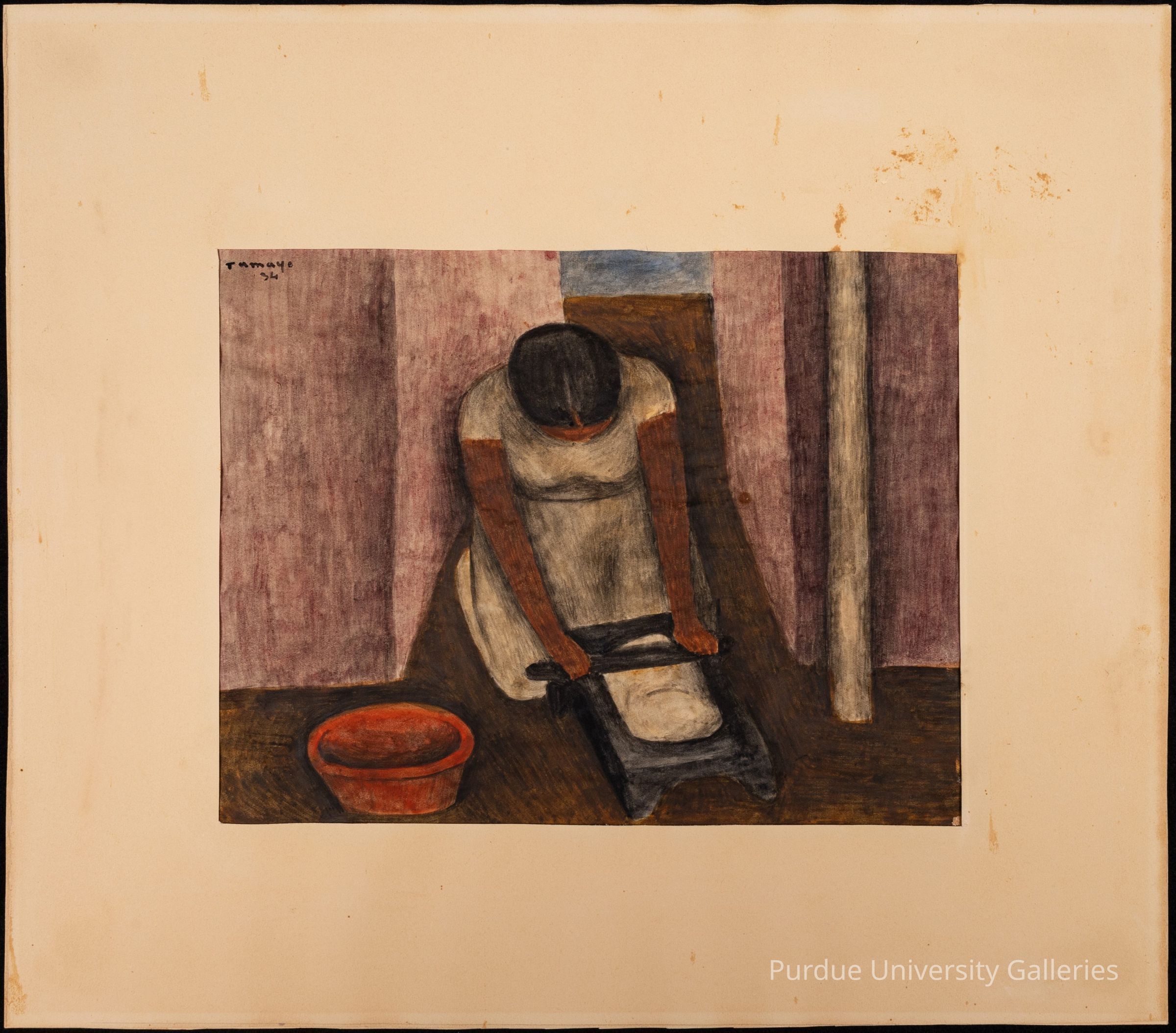 A woman kneels as she grinds maize on a flat mortar and pestle.Type of Painting