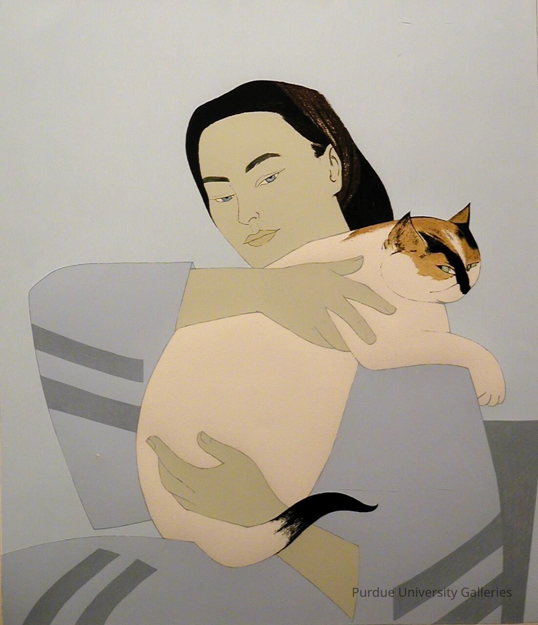 serigraph of a woman with brown hair and loose gray clothing holding turtle shell cat. Both of whom gaze directly at the viewer with green eyes. Woman's right hand placed on the upper portion of the the cat as her left holds the lower half. The background is a sold gray