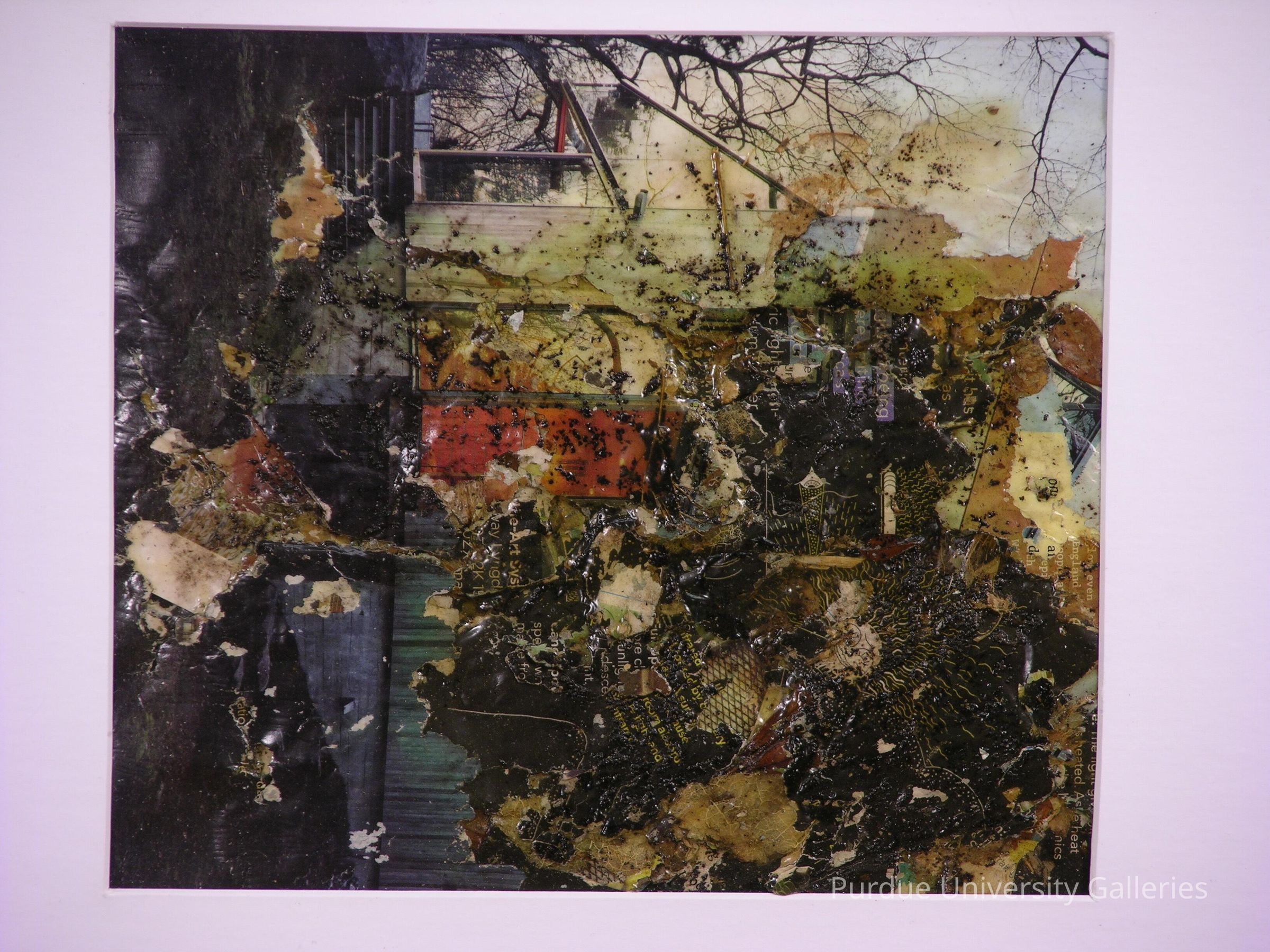 The collage is a mix of various magazines, and what looks like coffee grounds which have been placed over the right-hand top corner primarily but is seen throughout the piece. An image of a tree is placed on the left-hand side of the piece, along with what looks like a door and a set of steps. As the viewer moves their eyes from left to right, the piece becomes more chaotic and dynamic with the varying textures, designs, and colors of the different magazine pages. The overall composition is heavily affected by the texture of the magazine pages, the colors which moves from light to very dark in the outer bottom corners, as well as the treatment of the surface which looks to be some kind of adhesive or glue laid over top. The proportion of the included images of the steps, trees, and doorway seem to be in scale with the rest of the piece, and the difference between the left side and the overwhelming “explosion of color and texture” of the right creates a very interesting composition. Furthermore, the depth which is created by the layering and the bunching of the pages counters the balance of the piece as the dominant side is the right, and it draws emphasis on the right rather than a more central image. With removal of the frame the back is revealed to be a collage further than the mat board on top. The back reveals large pieces of paper and magazines and ripped and pasted. Large magazine pieces line the back as other pieces of paper, coffee gerunds and flora are exposed from another angle.Inscription/Signature/Marks