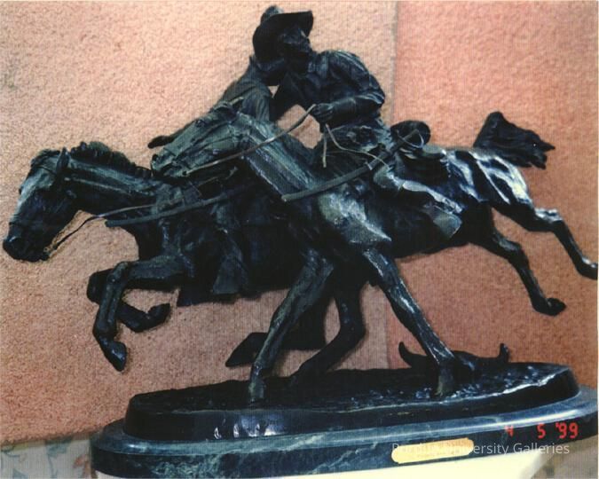 "Remington had such success with his first version of The Bronco Buster that he decided to produce a second one half again as large as the first. He wrote to Bertelli at the Roman Bronze Works that “this size lends itself to my hand much better than the smaller.”1 When the model was finished he sent off an enthusiastic note to the foundry. ""Say Bertelli, you ought to see the 11/2 Bronco Buster -- It will make your eyes hang out on your shirt. Get ready to retire the small one -- mind you.""2 1 Letter from Remington to Riccardo Bertelli, undated (1909), in the collection of the R. W. Norton Art Gallery, Shreveport, Louisiana. 2 Letter from Remington to Riccardo Bertelli, undated (1909), in the collection of the R. W. Norton Art Gallery, Shreveport, Louisiana. ------ 1999.13.01 & 1999.13.09 Frederic Remington was defined by the Old West. His obsession with the lives of countless Native Americans, cowboys, and military men drove him to attempt to recreate with vivid details the drama and danger of their daily life. Not surprisingly, he focused on equestrian due to their inherent danger and beauty. Several of his bronze sculptures represent horses and horsemanship in their finest details. Remington enjoyed great success despite the fact that he had very little formal training in sculpture. He extended the possibilities of what bronzes can show as demonstrated by The Outlaw: the artist relished the challenge of pushing boundaries. He wrote to the head of the Roman Bronze Works, Riccardo Bertelli, a post card with a sketch of a bucking horse and rider and under he wrote this conversation, “R: ‘Can you caste him?’ B: ‘Do you think I am one of the Wright brothers?’” Remington took a realistic view in The Outlaw. The cowboy sits leaning backward precariously on his steed struggling to maintain his balance and control, as his steed rears right into the curve. The riders face is frozen in a determined and confident expression, while in contrast the horse is frantic with energy and terror. The arching lines of the sculpture convey the excitement of the action, with the cowboy twisted in his saddle. We have the illusion that the bronze is alive and simply frozen at the peak of drama. Frederic Remington used realism extensively throughout his bronzes. The textures and details of the rider and horse are painstakingly depicted by Remington. He wanted to bring his idea of the Old West to the modern world of the East Coast. Like most of his other works, The Outlaw demonstrates Remington’s careful attention to the anatomy horse movement and the riders mastery over them. Frederic Remington created The Outlaw as a companion pieces to the The Broncho Buster. They are like a teeter-totter, creating a fluid flow from the start to finish of the horses bucking motion. Bibliography: Remington1960: [PAGE #s]; Hassrick 1973: [PAGE #s] ; Shapiro1981: [PAGE #s]; Hassrick 1988: [PAGE #s]; Remington 1993: [PAGE #s]; Nemerov1995: [PAGE #s]; “Frederic Remington (1861-1909).” http:// www.christies.com/LotFinder/lot_details.aspx?intObjectID=5154232; Amon Carter Museum, “Works of Art.” http://www.cartermuseum.org/works-of-art/1999-22 Submitted by Eric Engle"