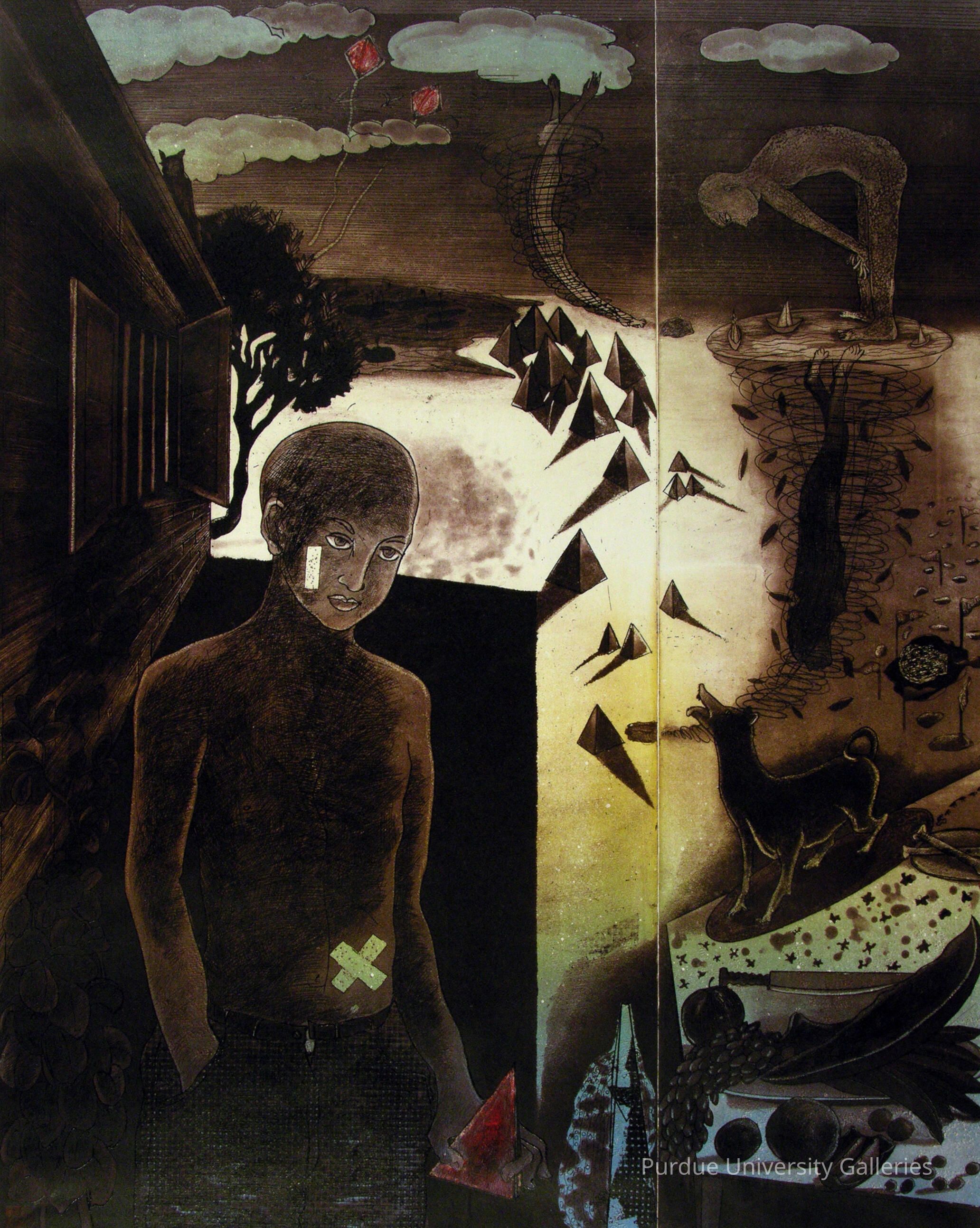 “Wounded Silence” seems to pictorially tell the story/dream of a young boy through symbols such as whirlwinds, pyramidal shapes and kites, while in this symbology bandages suggest wounds of an emotional rather than physical nature."