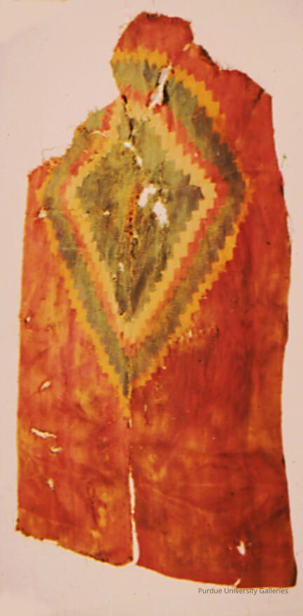 Fiber, alpaca. Woven fragment which contains diamond motif in heavy weight discontinuous warp face. It is in the form of four attached pieces and was probably part of shirt. Colors include red, yellow, blue, green, and white.Acquisition
