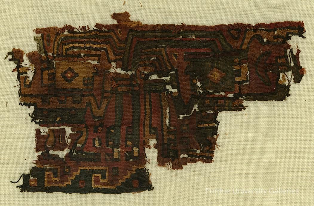 Fiber, alpaca, and cotton. Woven fragment which contains a representation of two warriors in battle, each holding the others headdress in one hand and a battle axe in the other. Woven in fine tapestry technique. Colors: red, black, yellow,green, blue, gold, and white.Acquisition