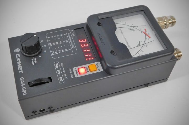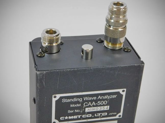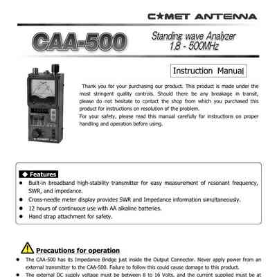 The COMET CAA-500 is a standing wave analyzer designed for antenna testing. It features a built-in broadband high-stability transmitter that allows for easy measurement of resonant frequency, SWR, and impedance. A key feature is its cross-needle meter display, which provides both SWR and impedance information simultaneously. For portability, it can operate for 12 hours continuously using standard AA alkaline batteries.
