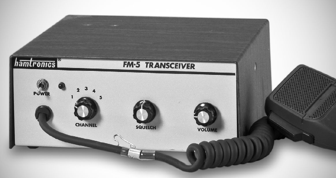 The Hamtronics FM-5 was a single-board transceiver kit complete with volume, squelch, and channel select controls, which were board-mounted. Its price started out at $159.95, less cabinet, mike, and crystals. Another $59.95 bought a complete cabinet kit with an on-off switch, knobs, and connectors. The mobile bracket ran another $5.95, and a mike was an additional $14.95. They would also supply crystals at $6.95 each. The FM-5 was a very basic FM transceiver, with 5 channels, no CTCSS, and no meter. It was available in 50, 144, and 220 MHz versions Output power was 10 watts on 50 and 144 MHz, and slightly less on 220.