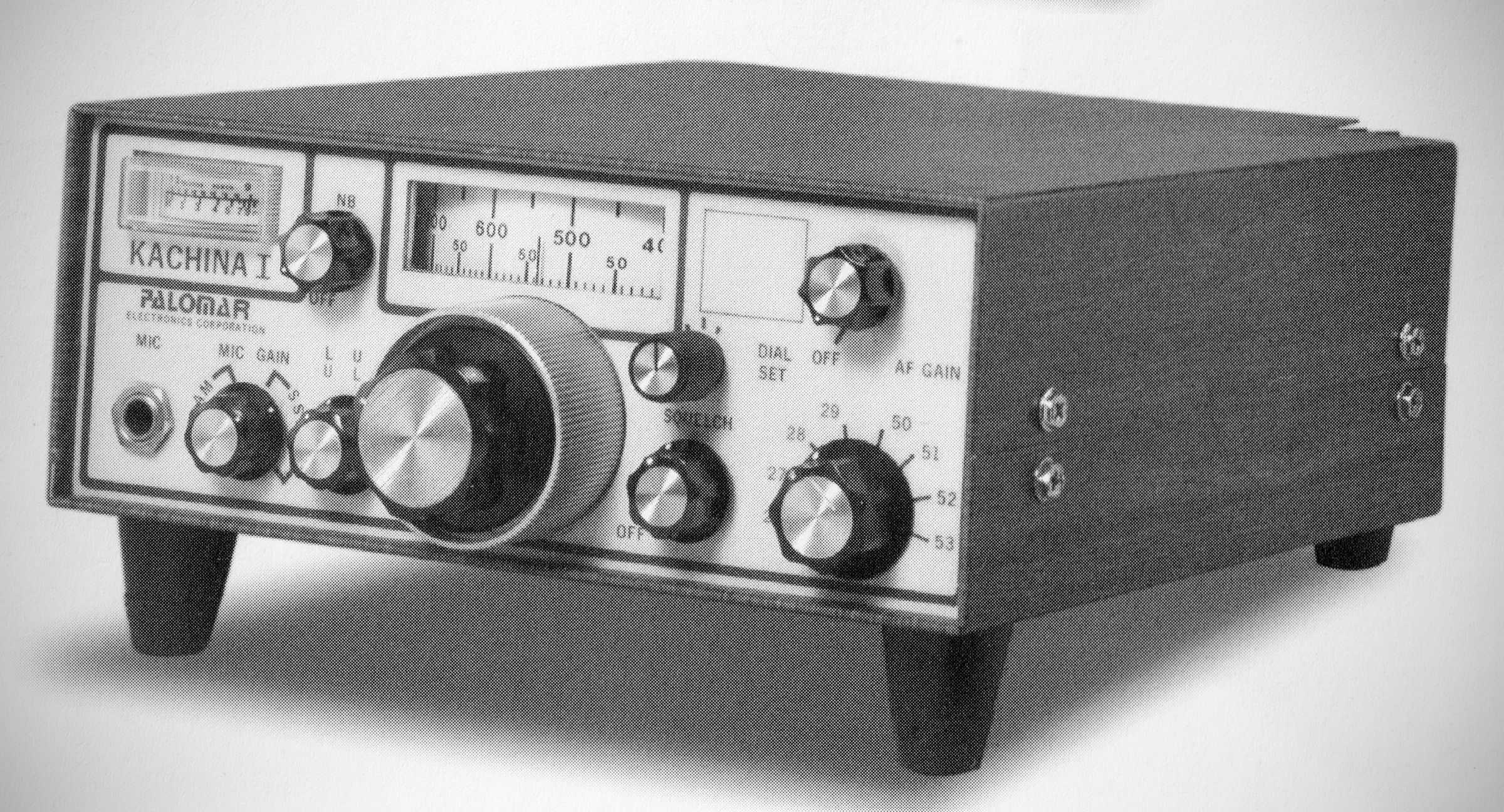 In the late 1970s, Kachina Communications of Sedona, Arizona manufactured a compact SSB/AM transceiver that covered 6 and 10 meters. SSB power input was 75 watts PEP on 10 meters and 65 watts on 6. AM input was about 18 watts on both bands. The receiver featured a noise blanker and squelch. The transceiver tuned in 1 MHz segments. In addition to the 6 and 10 meter bands, it also tuned from 26-28 MHz–spectrum that had not been allocated to the amateur service for a quarter century. Kachina Communications sold the manufacturing rights to Palomar Electronics, who produced the transceiver under their own name. It was given a cosmetic facelift and minor front panel changes. Looking closely at the area to the right of the dial, it is still possible to see the not-too-cleverly painted-over Kachina logo.