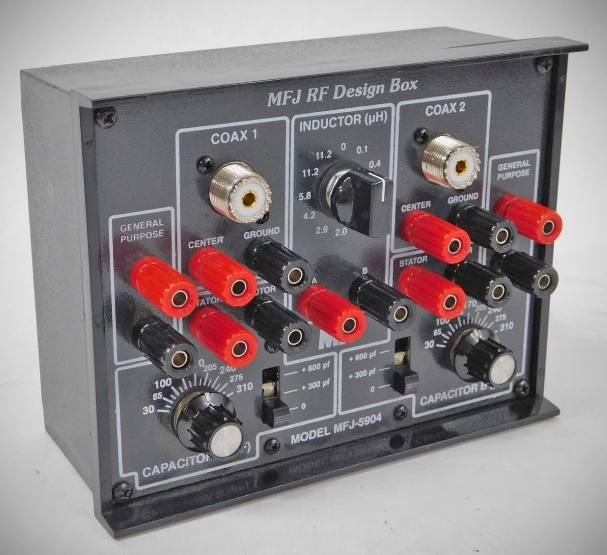 The MFJ-5904 provides two adjustable capacitor banks, each with variable and switched components to provide any value between 12 pF to 912 pF. It also provides a switched toroid inductor assembly that is adjustable from 0.1 to 11.2 uH in 12 steps. All tunable components are RF-isolated from the aluminum front panel to ensure personal safety. Simply connect patch leads to configure the circuit -- then tune in the optimize values for peak performance.