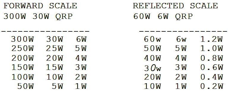 For QRP sensitivity (6-Watts FORWARD, 1.2-Watts REVERSE), you must perform a simple conversion to obtain actual power. You can convert in your head by moving the decimal point two places to the left and doubling the reading (ie. 300 W = 3.00 x 2 = 6 W). You may also multiply the scale reading times 0.02 on a pocket calculator.