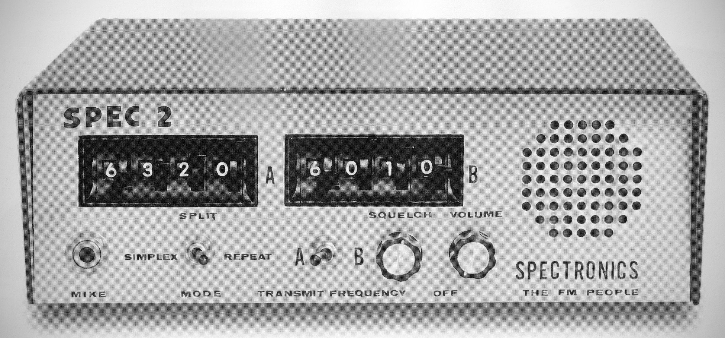 The Spec-2 synthesized two meter transceiver used an RP electronics MFA-22 synthesizer. The remainder of the transmitter and receiver components were from Motorola. The Spec-2 had two watts output and covered 144-147.99 MHz.