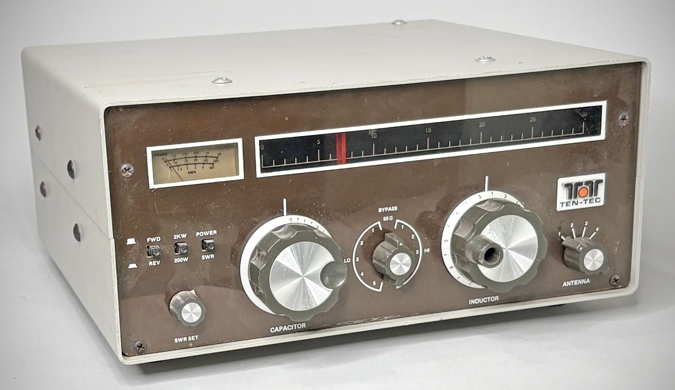 The 229A is a 2000 watt antenna tuner/SWR bridge/power meter. The tuner uses a reversible "L" configuration with a silver-plated roller inductor, high-voltage variable capacitor, and selectable fixed capacitors for greater versatility in impedance matching. The design automatically provides a low Q minimum loss path when properly adjusted.