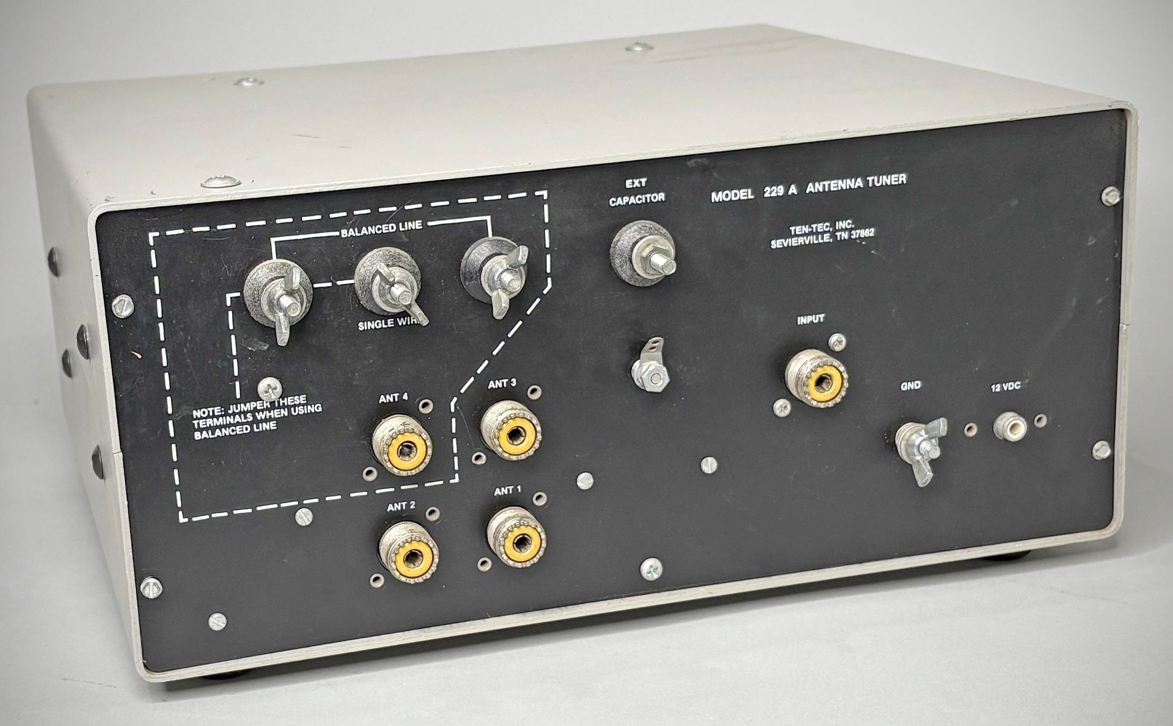 The rear panel includes coax input connector, four coax antenna connectors, three thumb-screw-type connectors for single wire and balanced line, ground connector, and 12 VDC input for dial lighting power.
