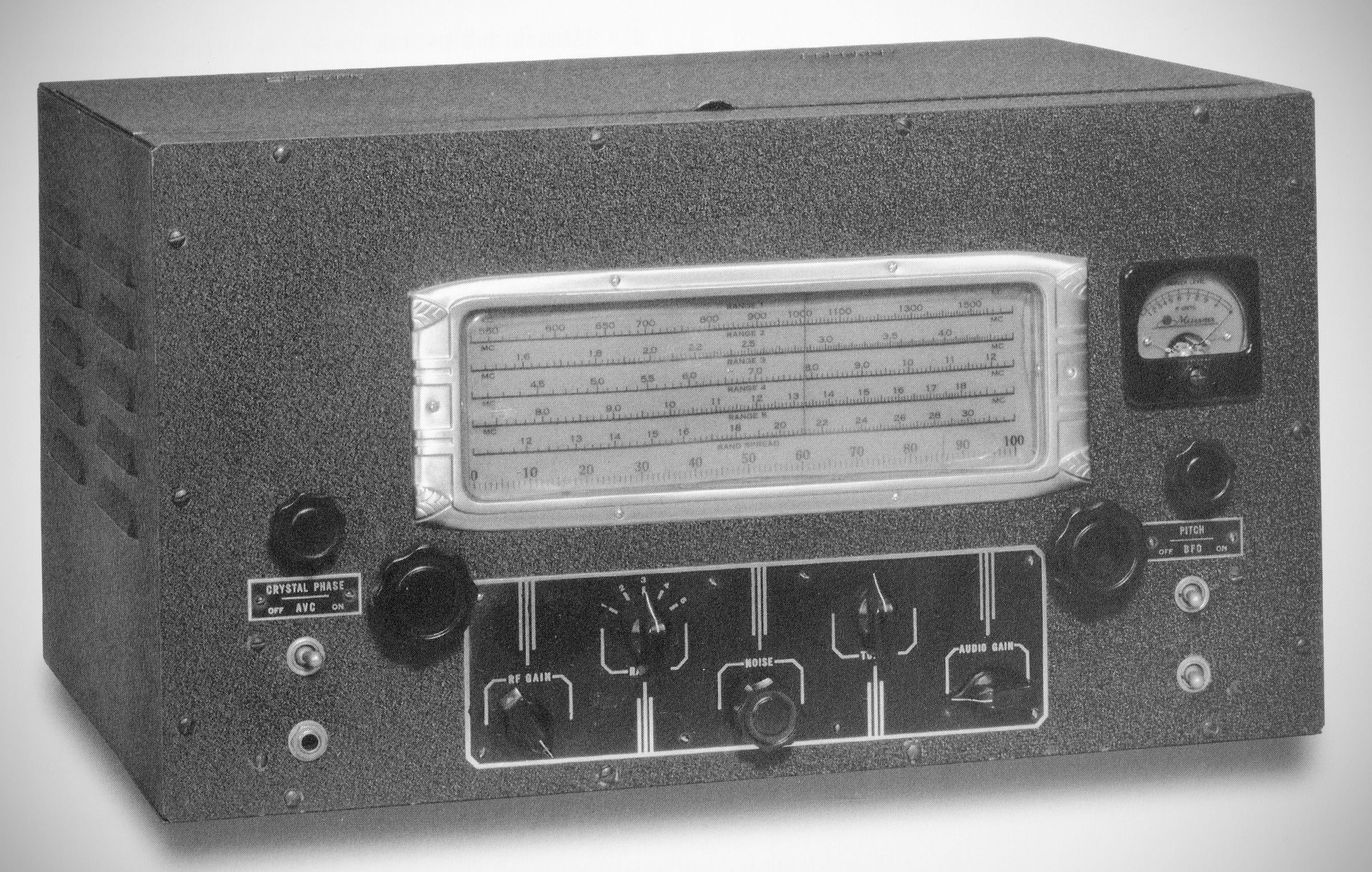 Features include a pre-aligned tuner assembly, 9" dial scales, air-tuned coils, "mono-unit" crystal filter (factory assembled), built-in "noise silencer," BFO, an "R-indication" meter, iron-core IF stages, tone control, headphone jack, and standby switch. Audio output: 8.5 watts.