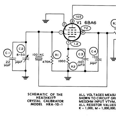 The calibrator is built on a small chassis with an octal plug on the base designed to plug into a mating socket on the HR-10(B) and Single-Banders. It is a simple crystal-controlled oscillator using a 6BA6 and provides harmonics from 100 kHz to at least 30 MHz. The calibrator can itself be calibrated against WWV by means of a small trimmer cap.