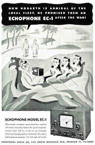 While the focus was on Hogarth's social life, the ads also subtly showcased the EC-1's practical benefits: its compact size (for a shortwave receiver of its day), ruggedness, and ability to pull in distant signals (shortwave coverage from 550 kc to 30 Mc).