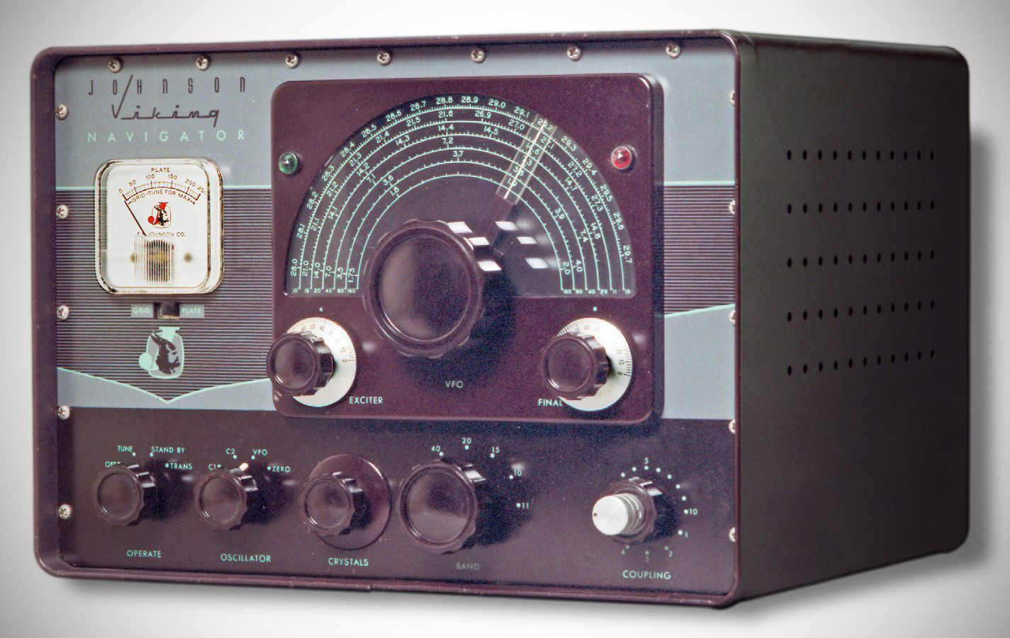 Johnson’s 40-watt Navigator was designed as a CW transmitter/exciter for the 160–10 meter bands. It featured timed sequence keying to eliminate clicks and chirps without giving up the break-in advantages of a keyed VFO. The Navigator used a 6146 PA.