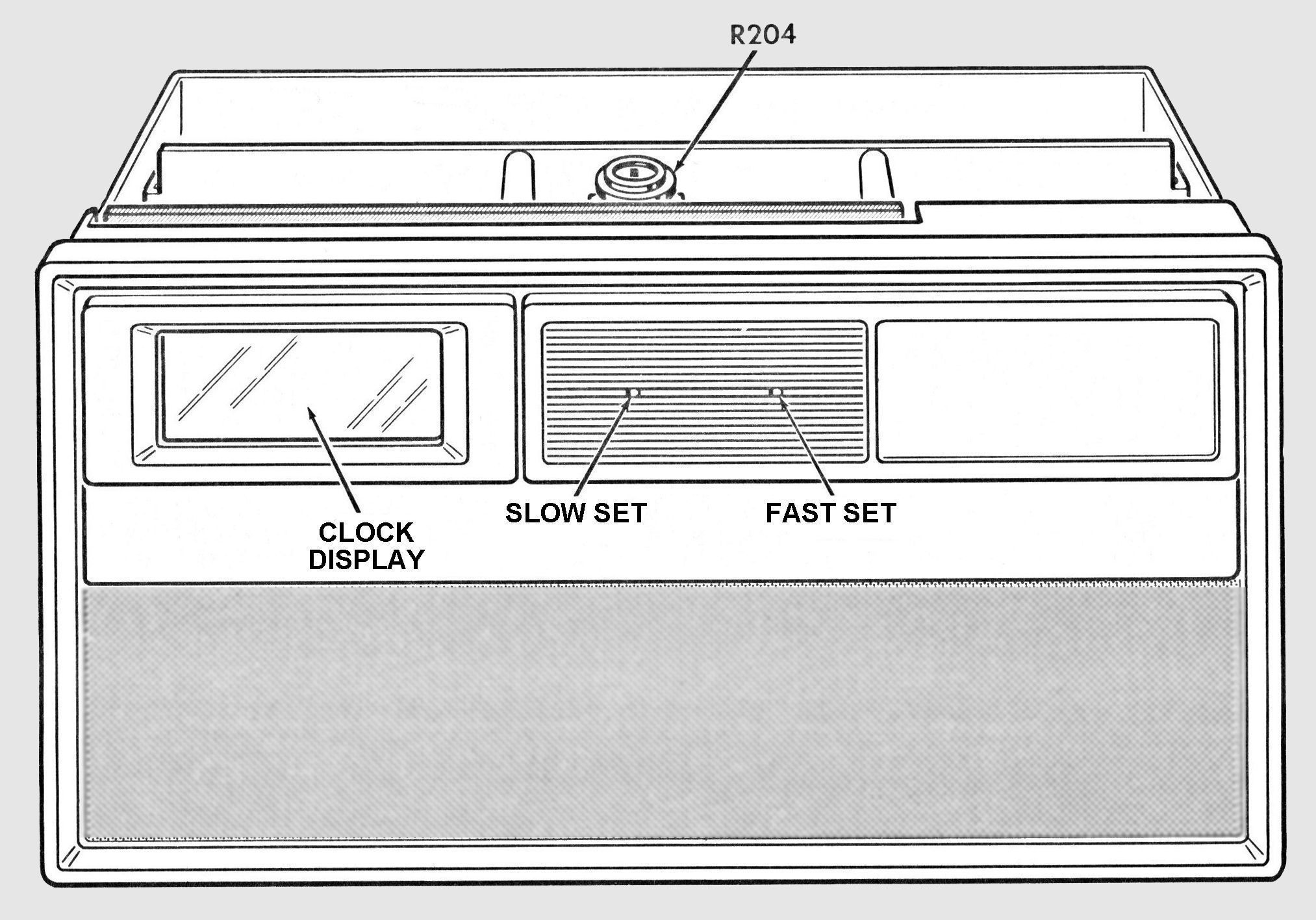 The clock is set by depressing the FAST and SLOW setting buttons, located behind a front panel grill. A paper clip, toothpick or other slender tool is required for this procedure. After initial power up, the clock should be cycled through a complete 12 or 24 hour period before setting to the current time.