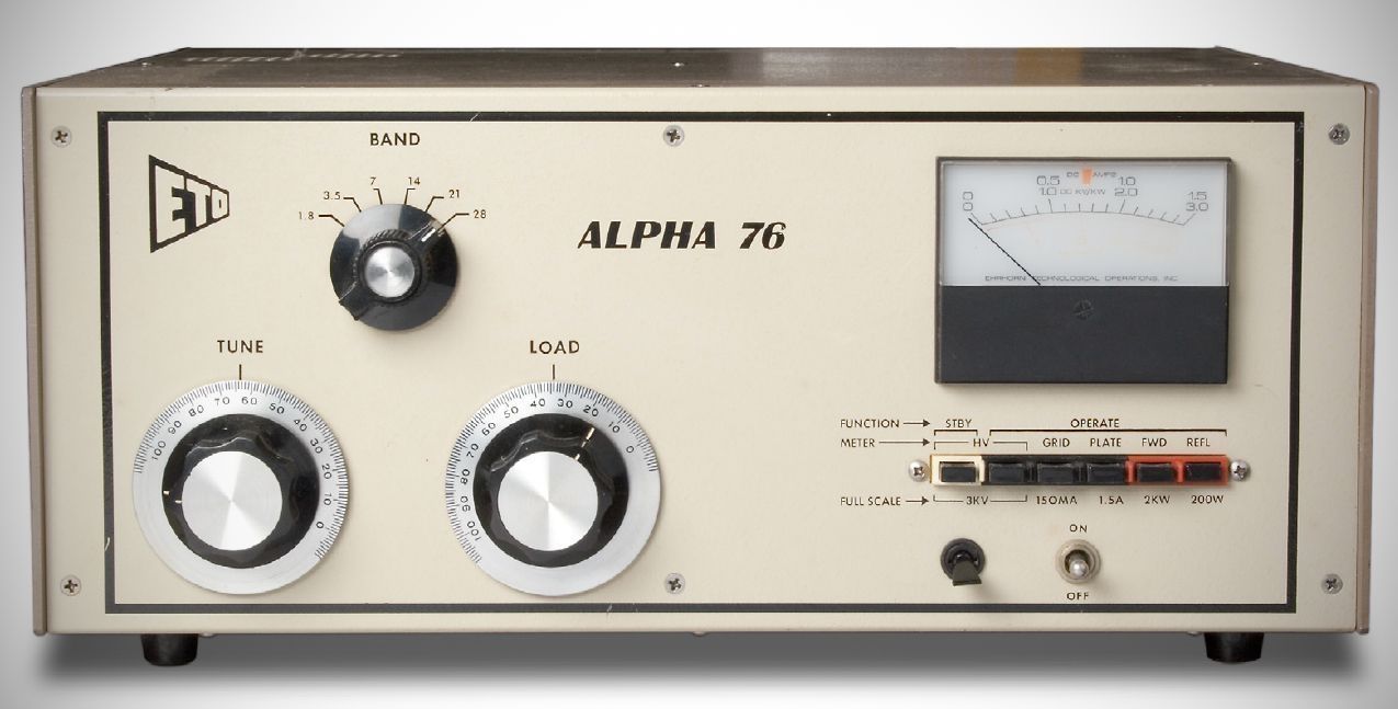 ETO’s Alpha 76 amplifier ran 2000 watts PEP and 1000 watts DC input with a pair of 8874 triodes in grounded-grid. The 76 covered the 160–10 meter ham bands and had manual tuning and loading controls. A variation of the amplifier had three tubes.