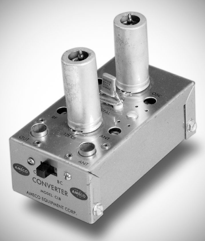 Ameco’s crystal-controlled CL-series mobile converters were adaptable to any frequency from 2–54 MHz. They used the 12 VDC car battery to furnish both filament and B+ voltages. The two-tube CLB operated on the 6 meter amateur band.