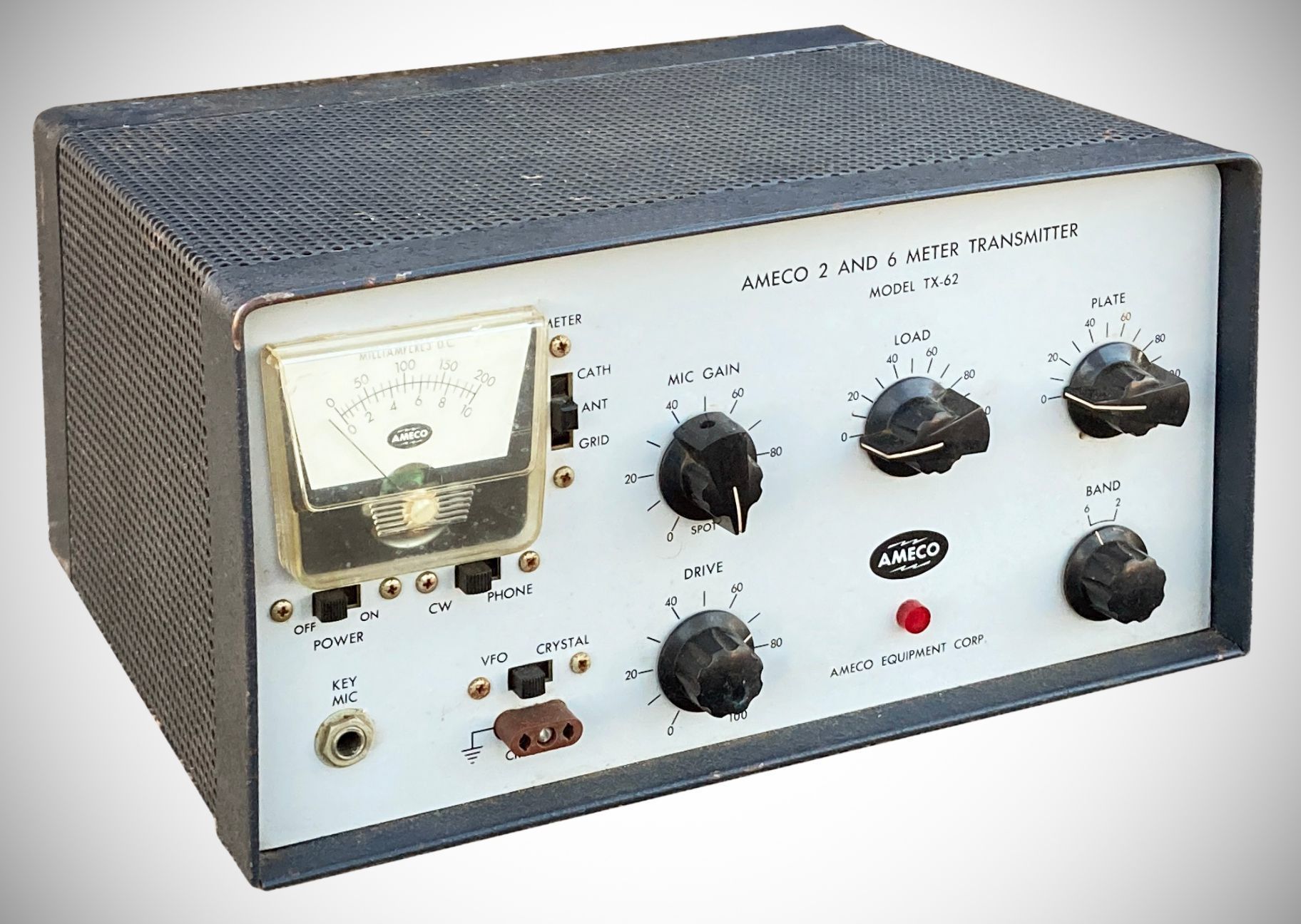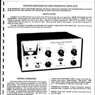 The TX-62 transmitter covered the 6 and 2 meter amateur bands. It ran 75 watts input on phone and CW. The power supply was built-in, as was the AM modulator. The TX-62 used 8 MHz crystals or an external VFO.