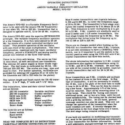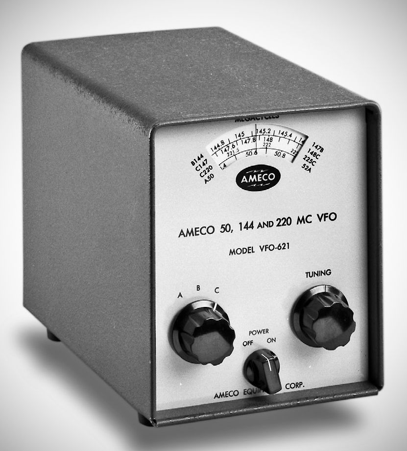 The VFO-621 was designed to work with Ameco’s TX-62 transmitter or other rigs compatible with its 24–26 MHz output. In addition to 6 and 2 meters, its dial was calibrated for the 1-1/4 meter band. The heterodyne-type VFO was transistorized.