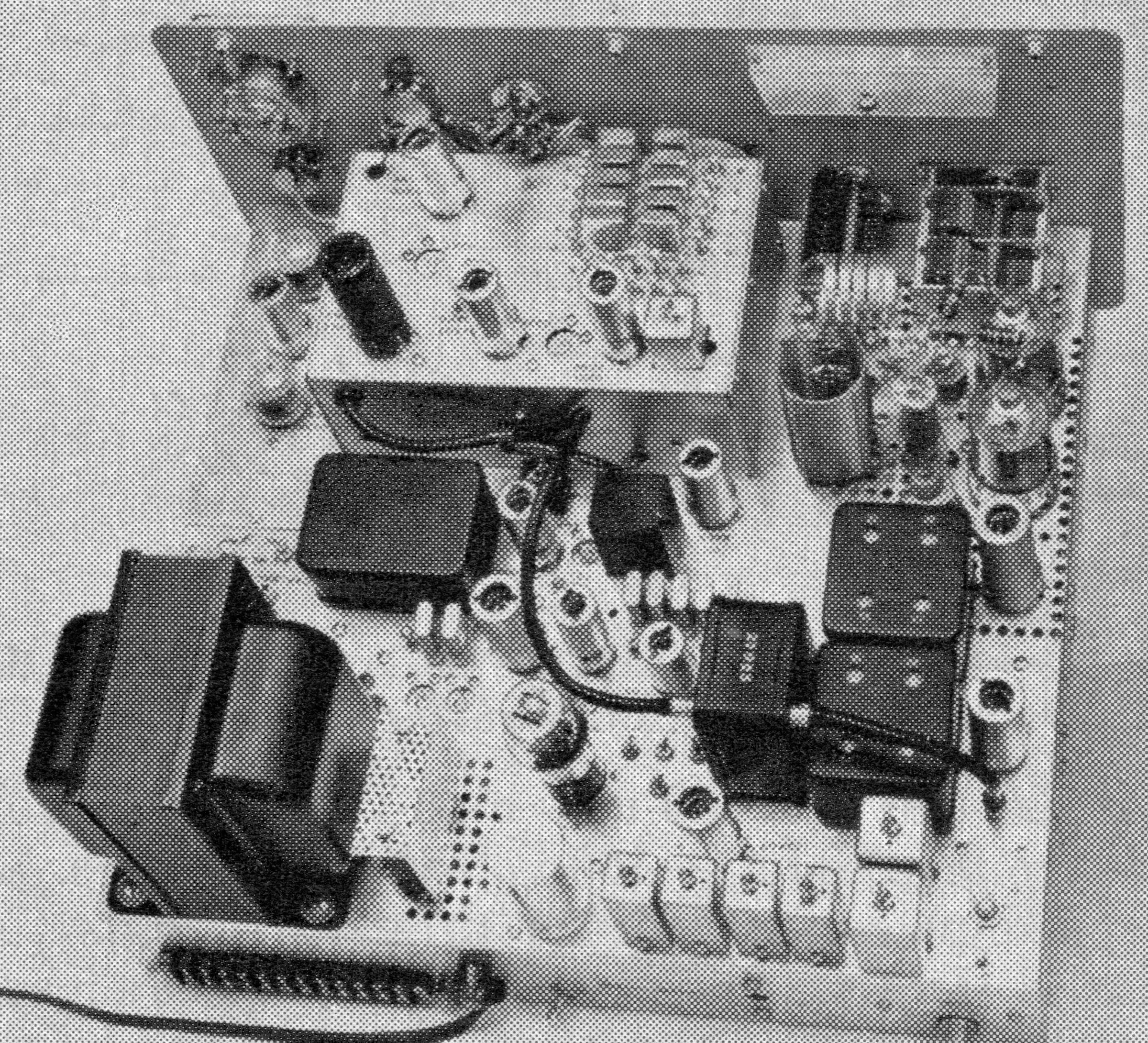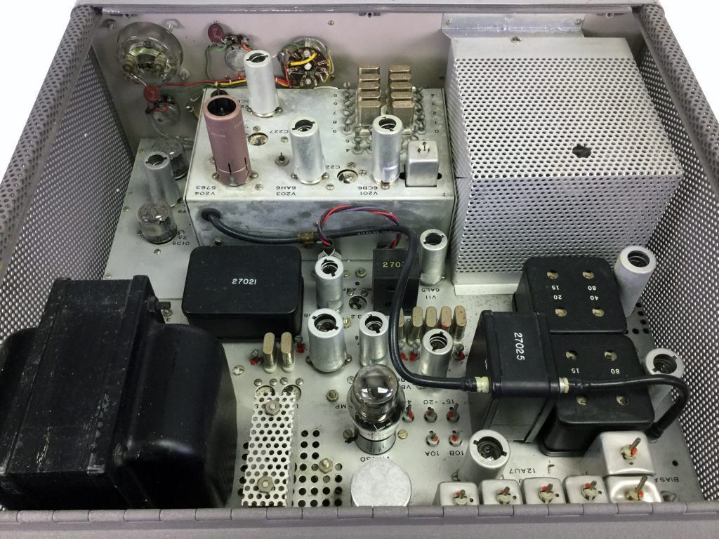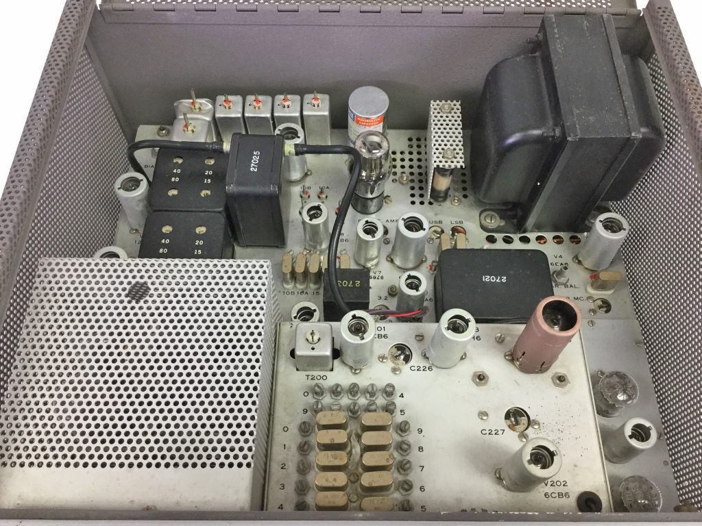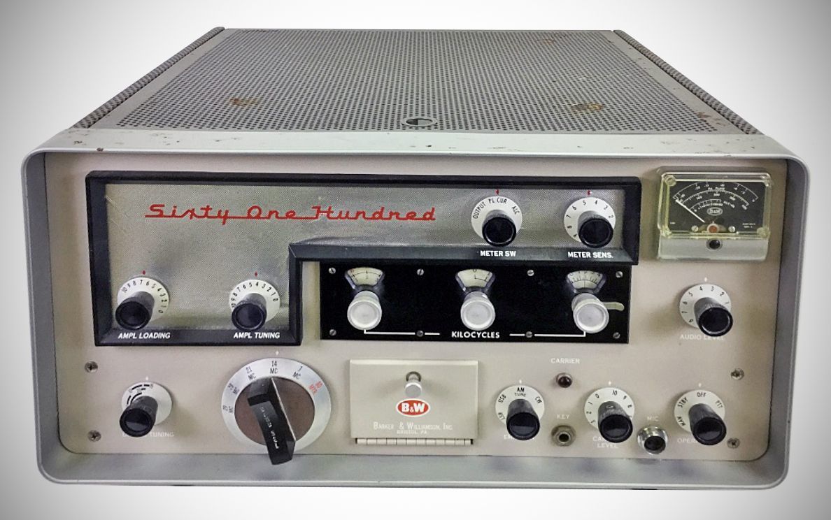 The B&W 6100 was the first synthesized amateur transmitter. There were no free-running oscillators in the 6100. Its synthesizer mixed signals from two banks of 10 crystals each to cover the 80-10 meter bands. A VXO circuit was used to pull the crystals from one bank up to 11 kHz, providing continuous coverage between each of the crystal frequencies. The operating frequency was set using the band switch and the three knobs marked "kilocycles." The 6100 ran 180 watts SSB and CW, and 90 watts on AM.