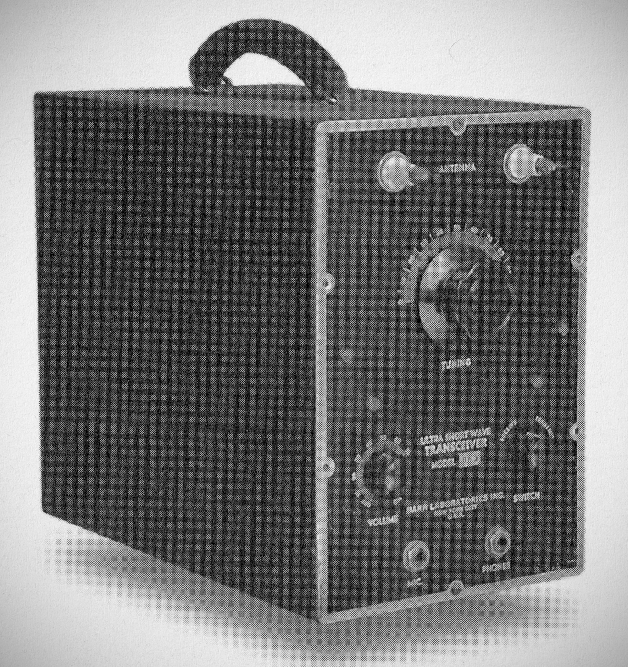 Barr's three-tube, 5 meter transceiver used Class B modulation and had a power output of 2 watts. Its self-contained power supply consisted of three 45 volt batteries, two 6 volt dry cells, and a 7 1/2 volt battery for bias.