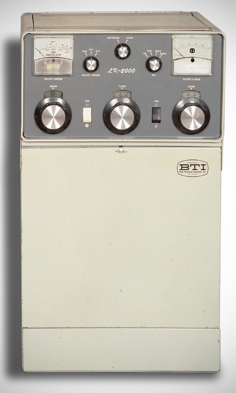 The LK-2000 from Brad Thompson Industries was designed for maximum legal input on all modes: 2000 watts PEP on SSB and 1000 watts on CW/AM/RTTY. The grounded-grid amplifier used a 3-1000Z tube and covered 80–10 meters. Its solid-state power supply operated from either 115 or 220 VAC.