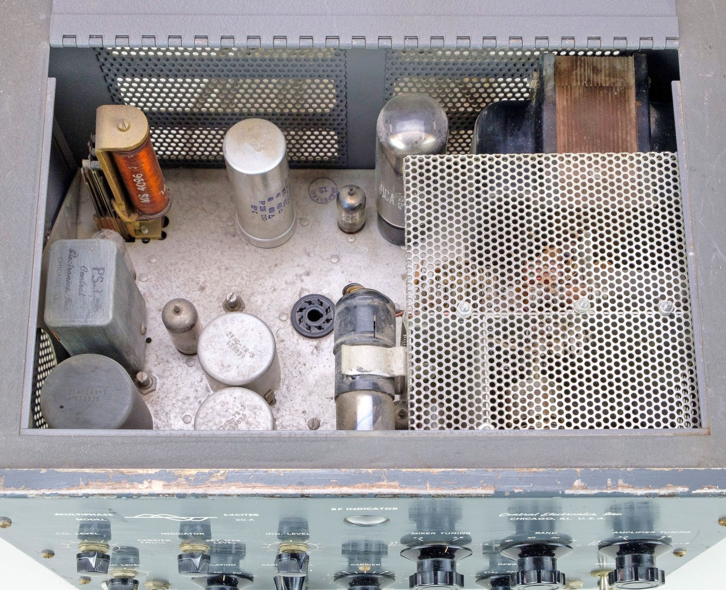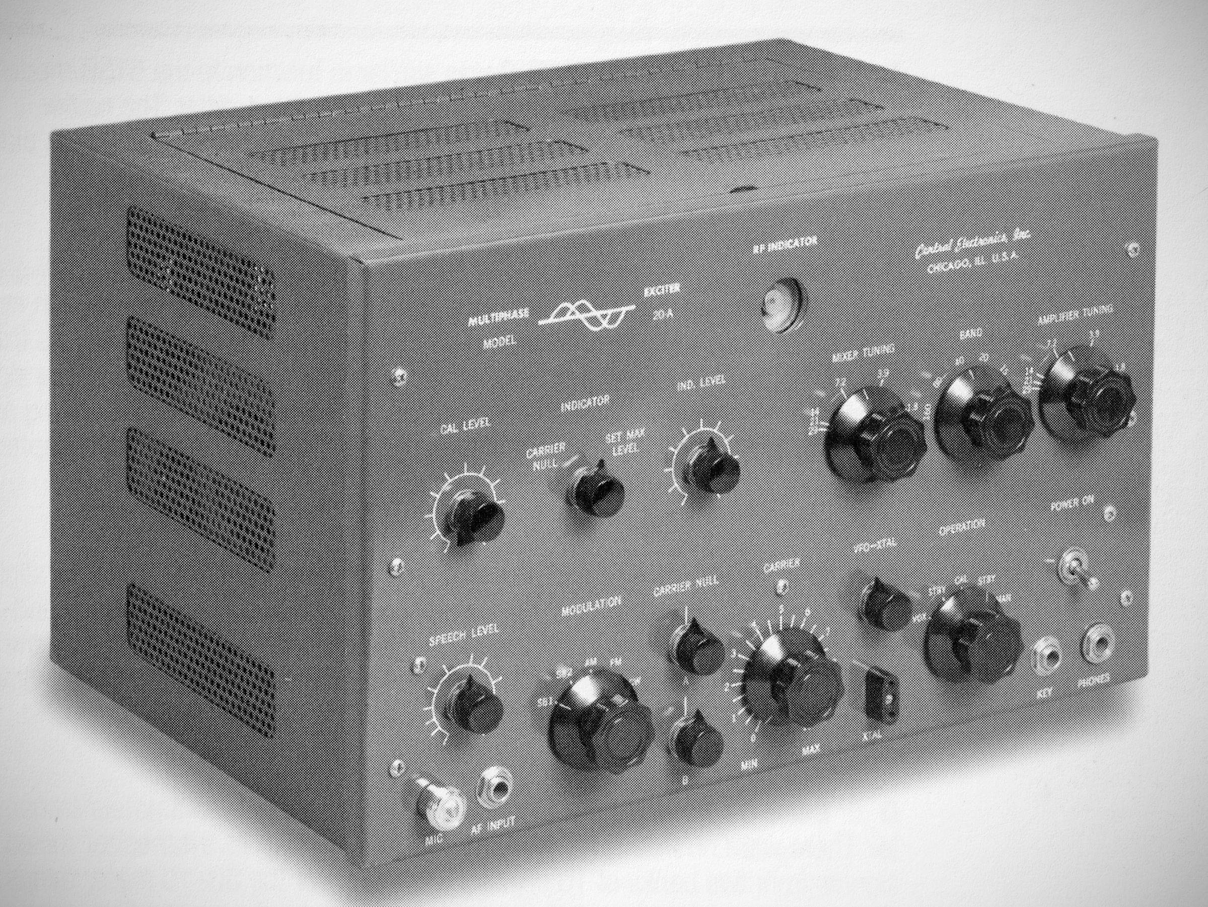 The 20A had band-switching coverage of 160-10 meters. Peak output on SSB, AM, CW, and PM was 20 watts. Its "magic eye" tube served as a carrier null and modulation peak indicator. A calibrate circuit allowed the operator to "talk" his VFO signal on frequency using the station receiver.