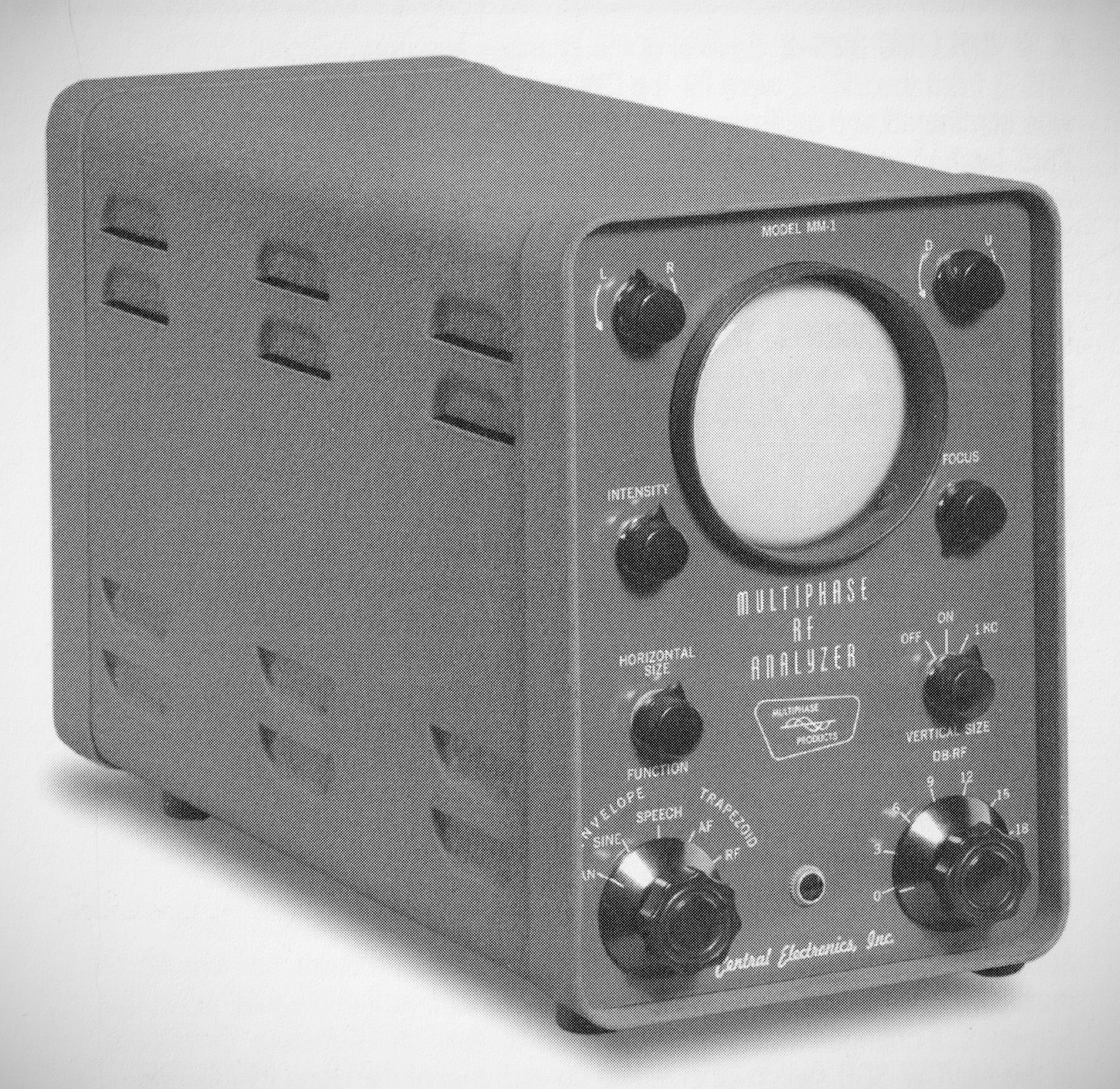 The MM-1 provided continuous monitoring of CW, AM, and SSB signals. Automatic blanking protected the 3 inch scope tube from burn-in during stand-by periods. The MM-1 's response curve was flat from 1-55 MHz. lt had a built-in 1 kHz tone generator and displayed AF and RF trapezoid and envelope patterns.