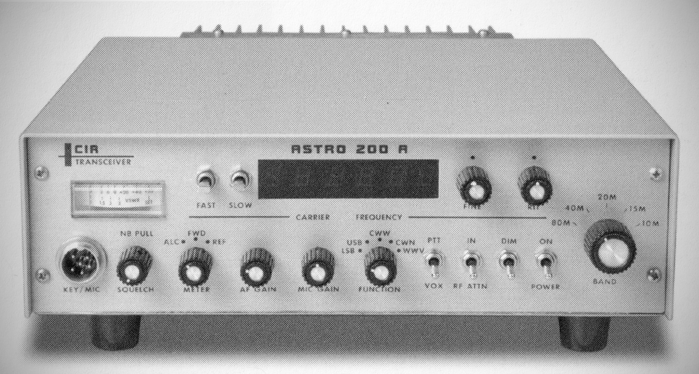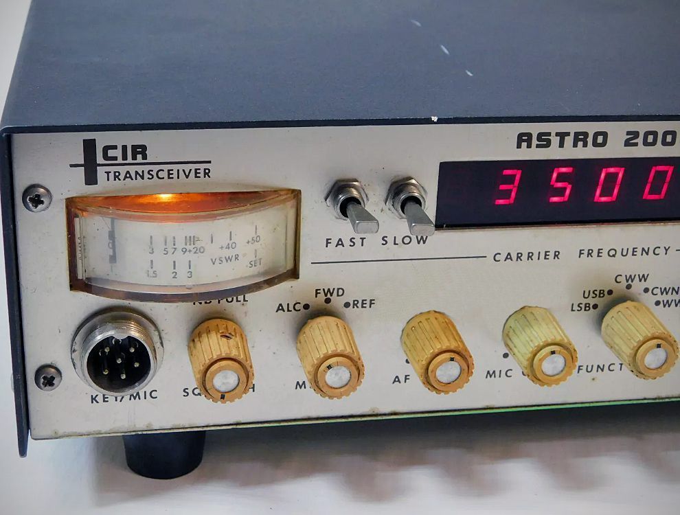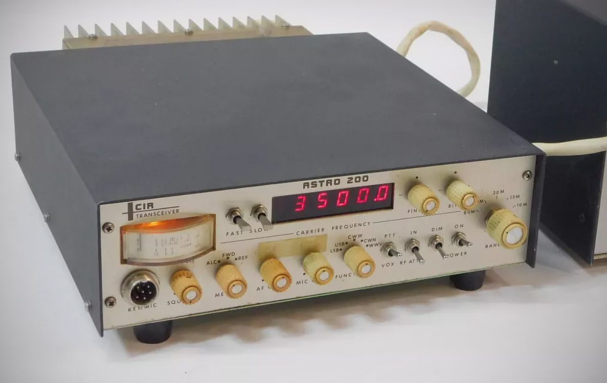 The Astro 200A added to the features found in CIR's Astro 200. It had up/down tuning buttons on the handheld microphone, an improved noise blanker, high SWR protection, and an illuminated meter. The synthesized 200 watt SSB/CW transceiver tuned the 80-10 meter bands in 100 Hz steps. A noise blanker, VOX, and speech processor were built-in.