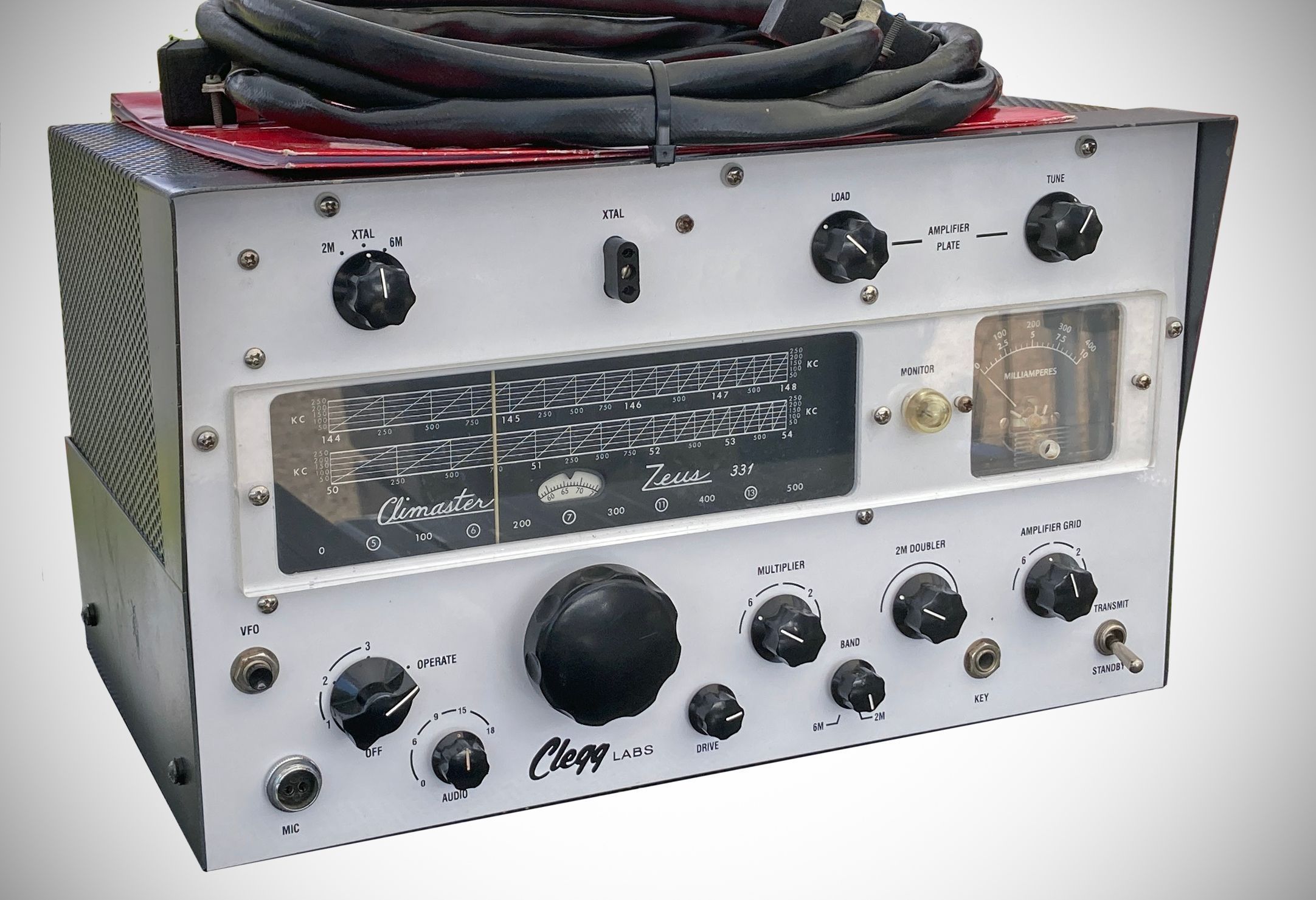 The driving force behind Clegg designs was Edward T Clegg, W2LOY (also W3 and W8LOY). The Zeus 6 and 2 meter transmitter featured a handsome Eddystone dial and had a power output of 125 watts AM and CW. The transmitter's clipper-filter circuit (called Automatic Modulation Control) gave it additional talk power on AM. The power supply and modulator were housed in a separate cabinet.