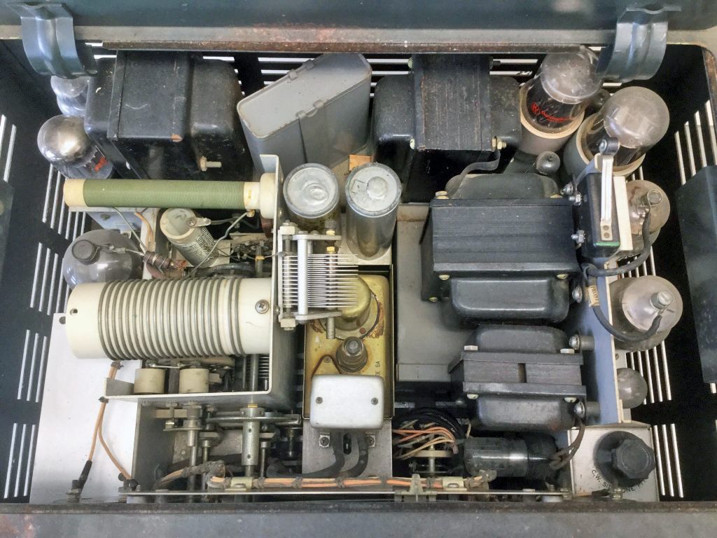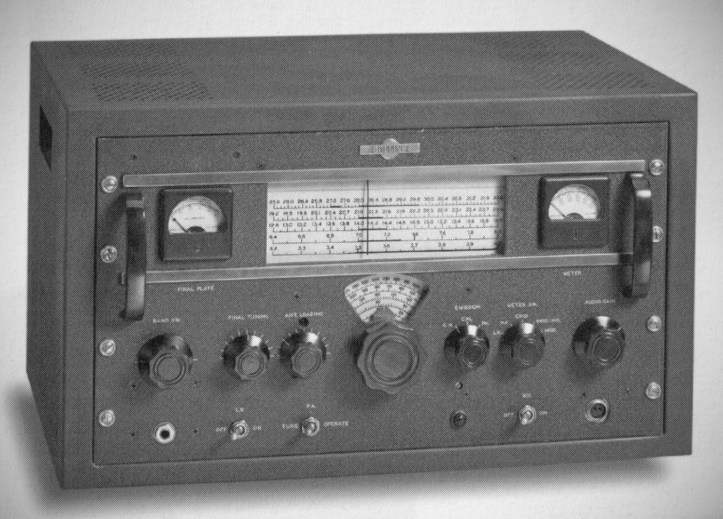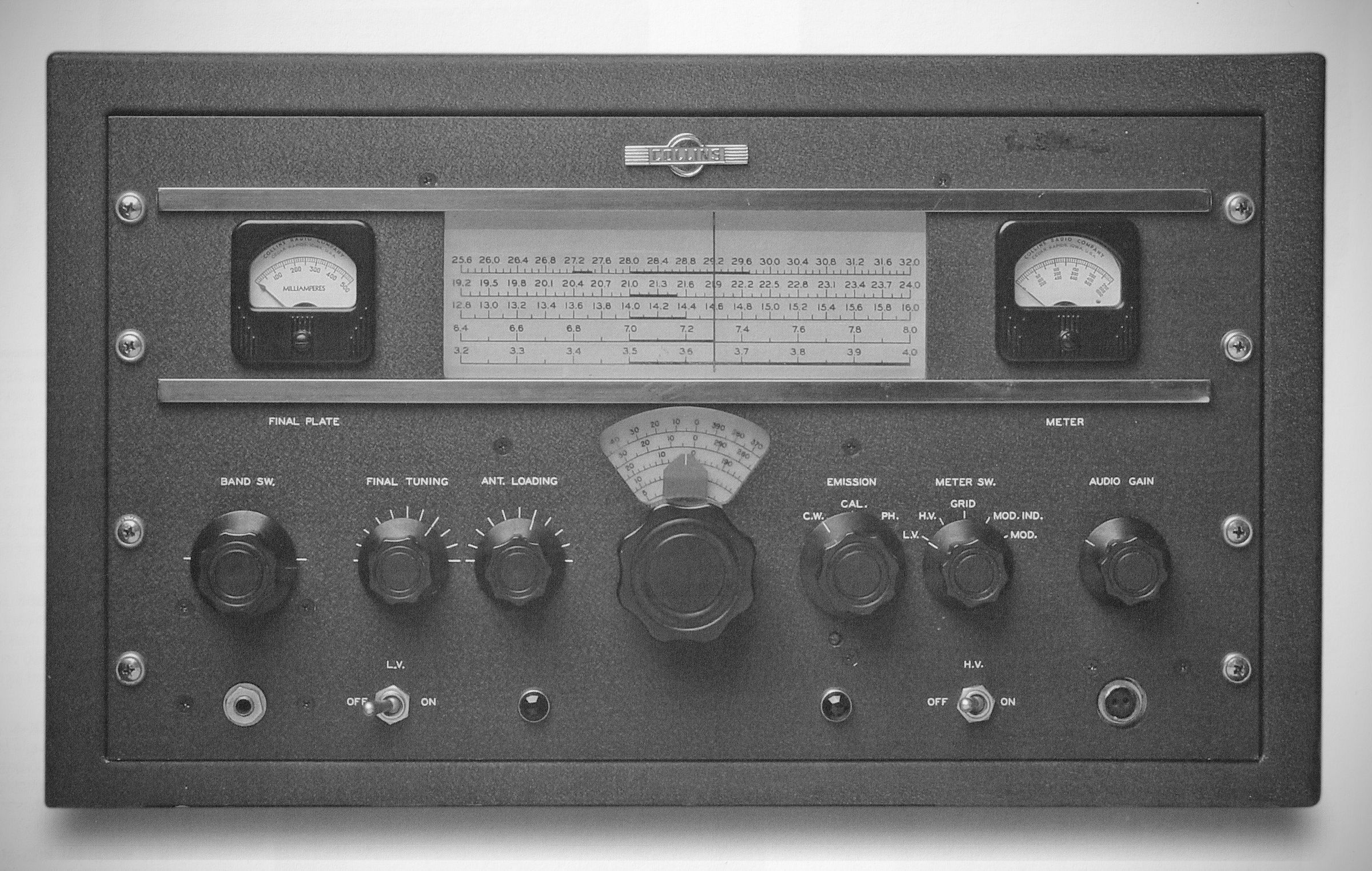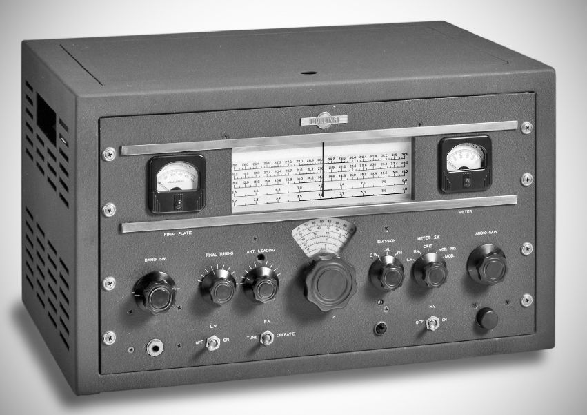The 32V-3 continued the company's TVI campaign, with alterations of the 32V-2 design. The new transmitter was installed in a lidless cabinet having different style ventilation holes. An additional shield for the RF section was added to that already present in the 32V-2, and bypassing was improved for external connections. The CW sidetone and muting circuits were eliminated. $775.00.