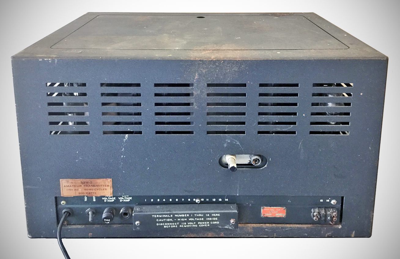 In 1949, the transmitter was superseded by the 32V-2. Differences included TVI measures such as improved shielding, both coarse and fine loading controlled by a single front-panel knob, an L-section added to the V-1's pi-net output, a coaxial connector on the rear panel, and a $100.00 price increase; $475.00.