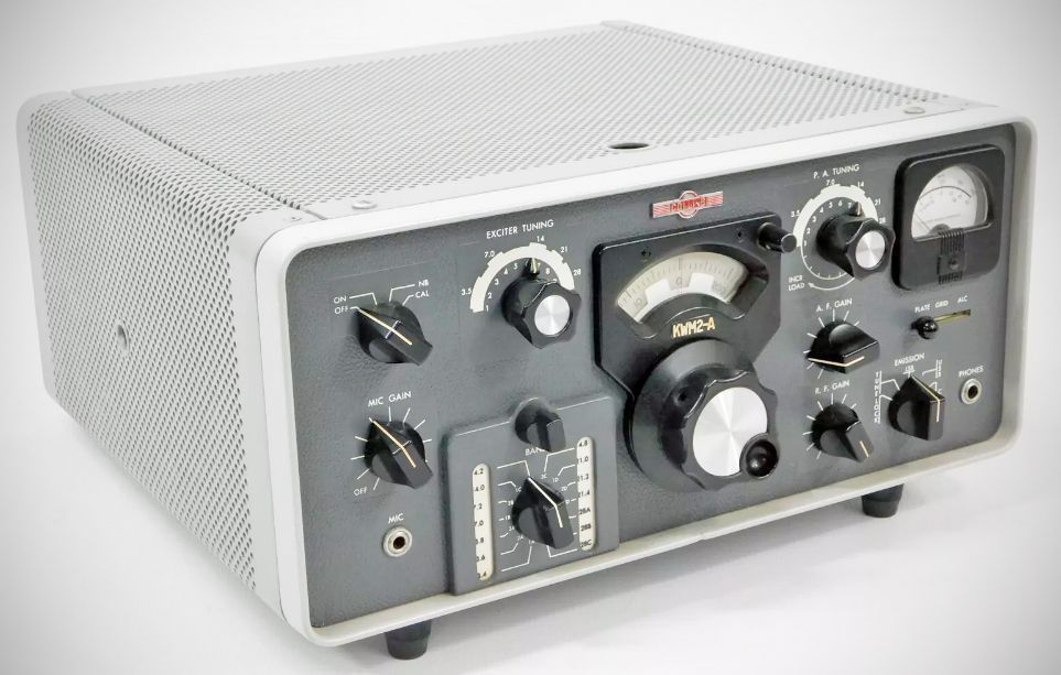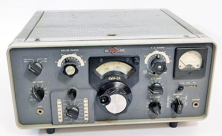 QST, Oct 1959, p. 3. QST, Jun 1963, p. 161. (KWM-2A) QST, Jul 1963, p. 2. QST, Sep 1963, p. 2. (KWM-2) QST, Seo 1973, p. 2. (KWM-2) QST, Sep 1975, p. 2. (KWM-2A) QST, Nov 1975, p. 2. QST, Dec 1975, p. 2. QST, Jan 1976, p. 2. (KWM-2A / 27,000 sold) QST, Mar 1976, p. 2. (KWM-2A / 27,000 sold) QST, Apr 1976, p. 2. QST, May 1976, p. 2. (KWM-2A / 27,000 sold) QST, Jul 1976, p. 2. QST, Feb 1976, p. 117. After the introduction of the KWM-2A, it and the KWM-2 were sold concurrently. The KWM-2 transceiver combined the circuits of the 75S-1 and 32S-1 in a single package with frequency controlled by one PTO. It was styled to match the S/Line and was intended mainly for sideband operation on 80–10 meters. It had a pair of 6146 tubes in the final and ran 175 watts PEP input on SSB. The KWM-2 and its KWM-2A variant underwent a series of updates and improvements, remaining in production until the early 1980s. The KWM-2A, released in 1961, is an extended frequency version of the KWM-2 for MARS (Military Affiliate Radio Service) and military applications. The KWM-2A has an additional crystal board permitting the operator to add 14 crystals to cover frequencies outside the amateur bands. A front panel switch and indicator permits instant switching between the two crystal boards. An ad in the January 1976 issue of QST states that "...in the last 15 years some 27,000 KWM-2A units have been sold." Basic Features - Filter-type SSB generation - Selectable sideband operation - Automatic load control (keeps the signal level adjusted to its rated PEP, resulting in an increase in average talk power) - Inverse RF feedback to improve linearity and reduce distortion products. - A permeability tuned oscillator ("PTO") for better linearity and stability - Dial division of 1 kHz - CW break-in (though not true QSK) and sidetone Front Panel Controls OFF-ON-NB-CAL EXCITER TUNING ZERO SET PA TUNING LOADING MIC GAIN BAND SWITCH AF GAIN RF GAIN EMISSION METER SWITCH SPECIFICATIONS Frequency Range: 3.40–5.00 and 6.50–30.00 MHz Crystals are provided for all HF bands except 10 meters where one crystal is supplied with provision for two additional crystals Coverage (as provided, in MHz) 80 meters – 3.40–3.60, 3.60–3.80, and 3.80–4.00 40 meters – 7.00–7.20, and 7.20–7.40 20 meters – 14.00–14.20 and 14.20–14.40 WWV – 14.80–15.00 15 meters – 21.00–21.20, 21.20-21.40 and 21.40-21.60 10 meters – 28.50–28.70 Modes: USB, LBS, CW Duty Cycle: SSB continuous; CW 50% Calibration Accuracy: 1 kHz Backlash: < 50 Hz Visual Dial Accuracy: 200 Hz on all bands Stability: Within 100 Hz after warm-up Plate Input: 175 watts PEP SSB; 160 watts CW Power Output: 100 watts PEP (nominal) into 50Ω Output Impedance: Variable, 50 ohms nominal; will match 2:1 SWR RF Feedback: Approximately 10 db of RF feedback around PA and driver for improved linearity Harmonics and Spurs: Carrier suppression -50 db Unwanted sideband -50 db Oscillator feed-through and/or mixer products -50 db Second harmonic -40 db Third order distortion -30 db Noise Level: 40 db below single tone carrier Sensitivity: 0.5 uv for 10 db signal-to-noise Selectivity: 2.1 kc bandwidth at 6 db down; 4.2 kc bandwidth at 60 db down Receiver Spurious Response: Image rejection better than 50 db. Internal spurious below 1 µv equivalent antenna input Audio Output: 1.0 watt maximum Audio Input: High impedance microphone or phone patch Frequency Response: 300-2400 Hz + 6 db ALC: operates on IF and RF amplifier stages and is capable of 10 db compression AGC: audio output level does not change more than 20 db as the input signal is changed from 5 µv to 1 v. Fast attack and slow release provide excellent AVC action on voice and CW. Power Requirements 800 VDC @ 175 ma 275 VDC @ 190 ma Bias adjustable between –60 to –80 VDC 6, 12, or 24 VDC at 11.0, 5.5 or 2.75 amps respectively 115 VAC, 50-60 cps; 235 watts receive, 475 watts transmit Size: (with feet) – 14-3/4″ W, 7-3/4″ H, 14″ D; Weight: 18 Lbs. 3 oz References RTTY with. CQ, Apr 1961, p. 34. Independent receiver control. CQ, Mar 1963, p. 40. Improved frequency readout. Ham Radio, Jun 1976, p. 53. Modifications. Ham Radio, Aug 1976, p. 80. Improved stability. Ham Radio, Jun 1977, p. 81.