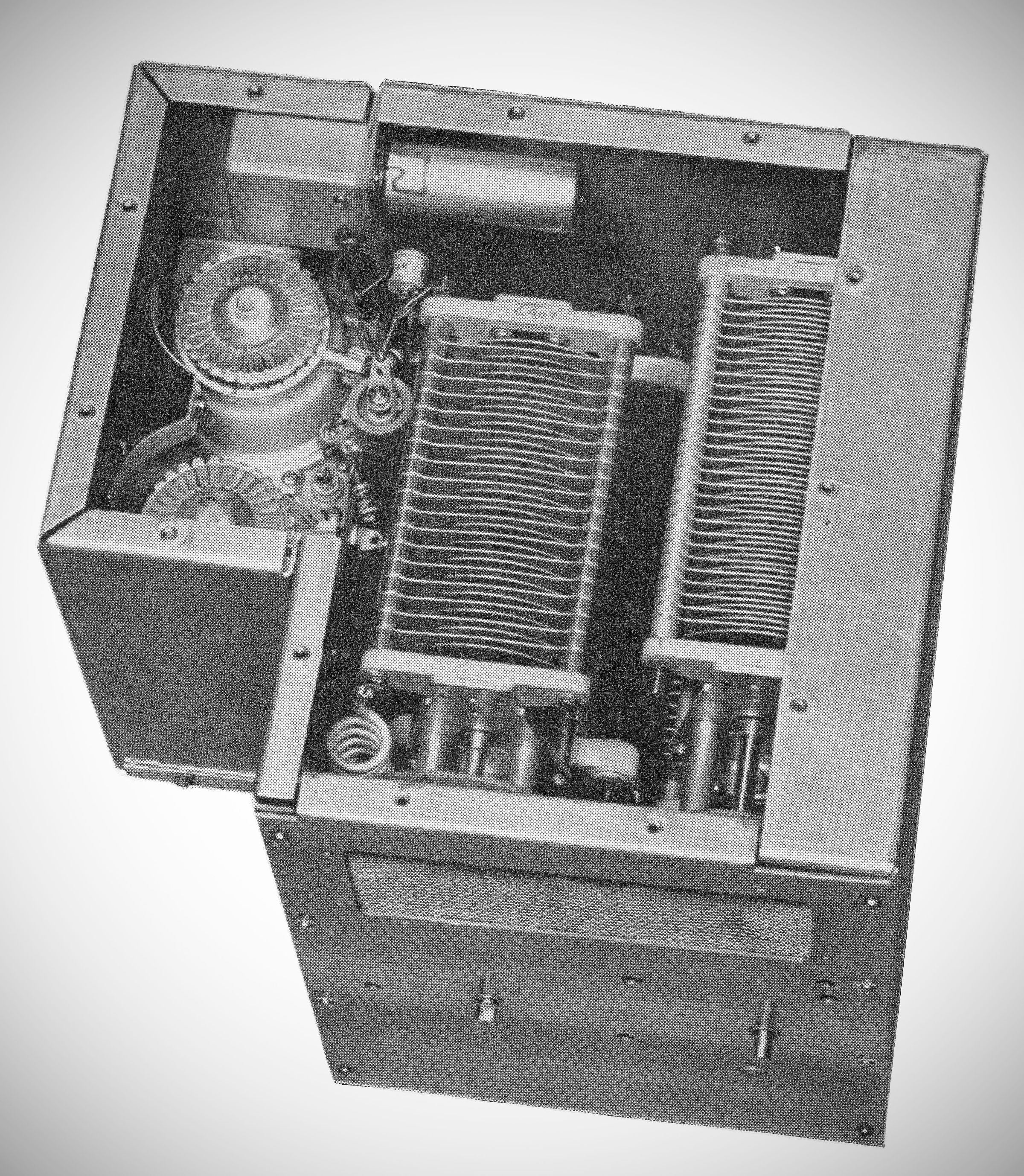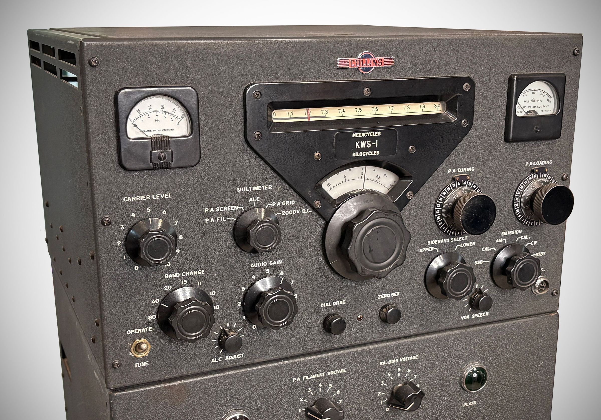 The KWS-1 was the Gold Dust Twins' transmitter sibling. Paired with a 75A-4, it not only defined the ultimate mid-50s amateur station but was also a key component in the Strategic Air Command's Big Talk communications network. Its complement of 33 tubes included two 4X150As in the final amplifier. Later versions used a pair of 4X250Bs. It covered the 80, 40, 20, 15, 11, and 10 meter bands, producing 1 KW on SSB, CW, and 650 watts AM.