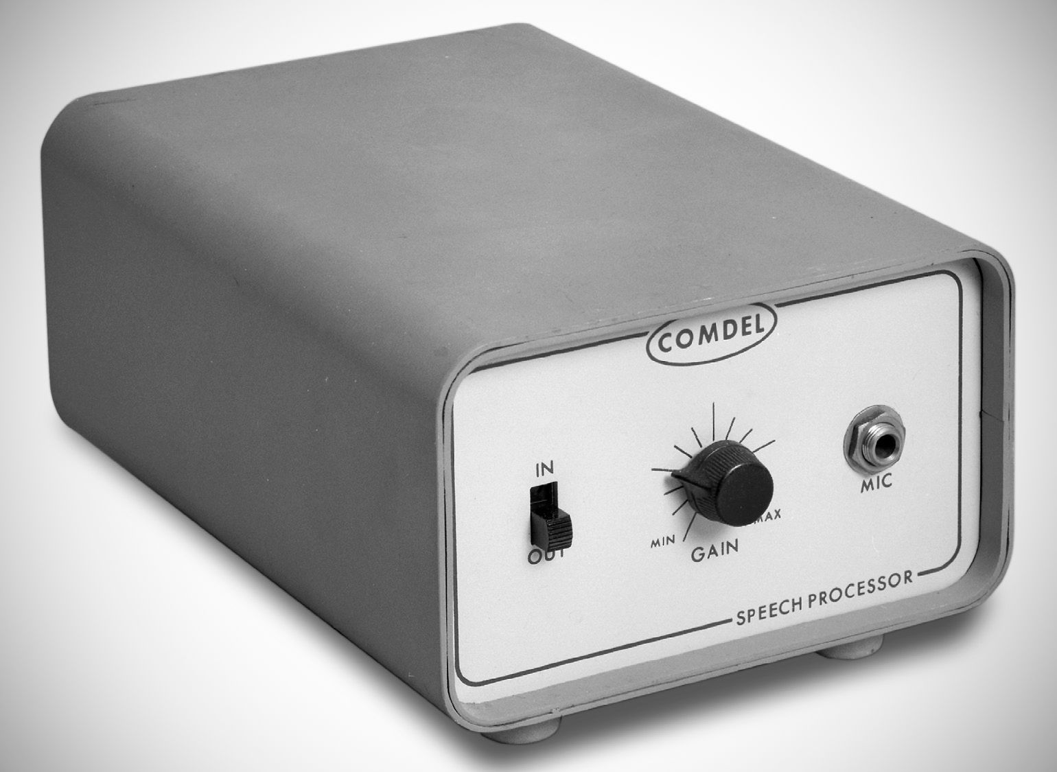 The Comdel CSP-11 speech processor featured instantaneous limiting action without the harmonic distortion typical of conventional speech clippers. The CSP-11 was powered by six internal D cell batteries or could use an external source.