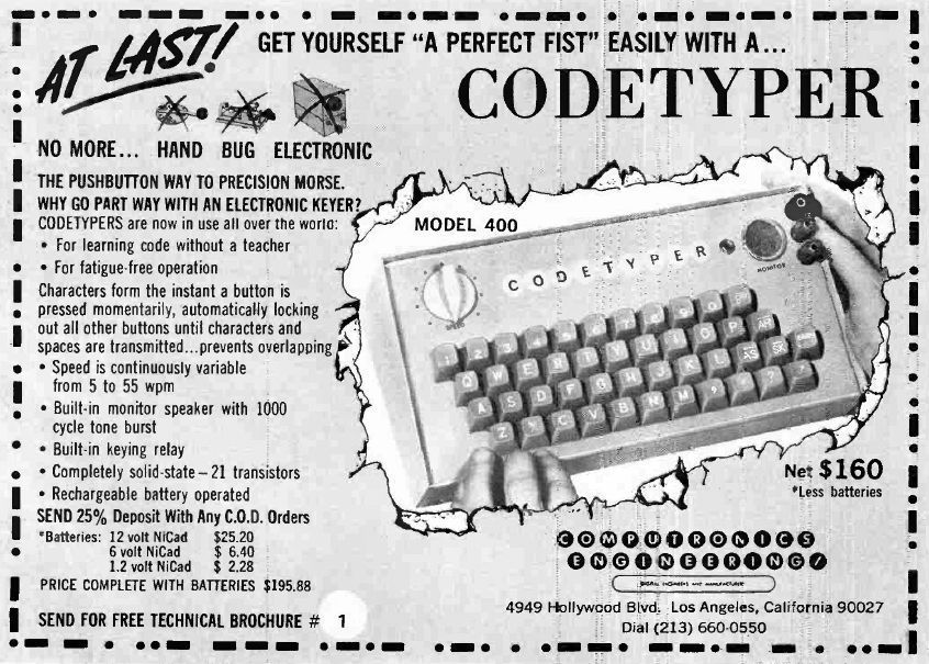 This was a "new products" announcement. No actual advertising for the Codetyper was seen until July 1971, in Electronics World. In the 1965 announcement the price was 299.50, but in the 1971 ad the price stated (without batteries) was $160. The ad ran only once. It is not known if any Codetypers were ever actually sold.
