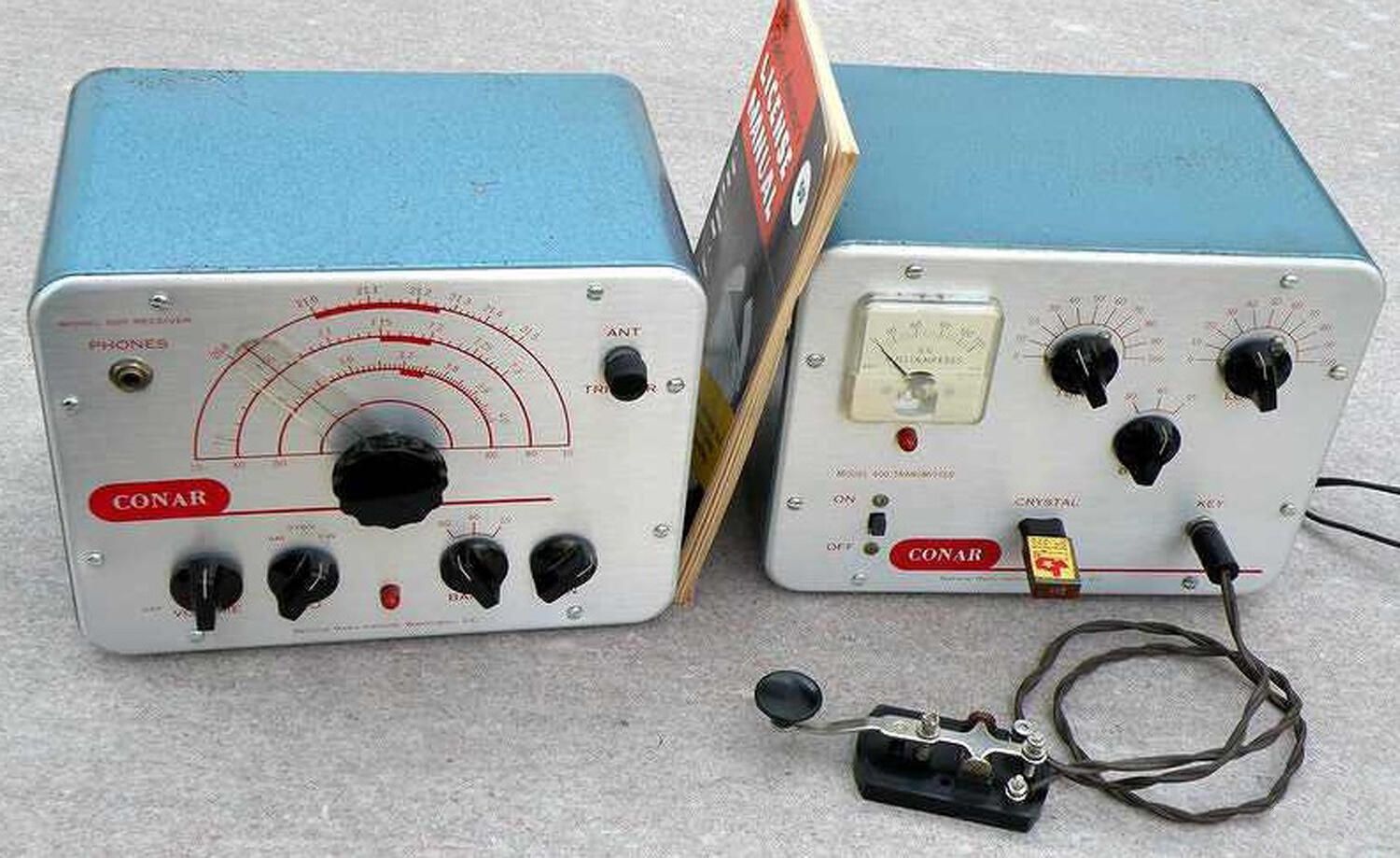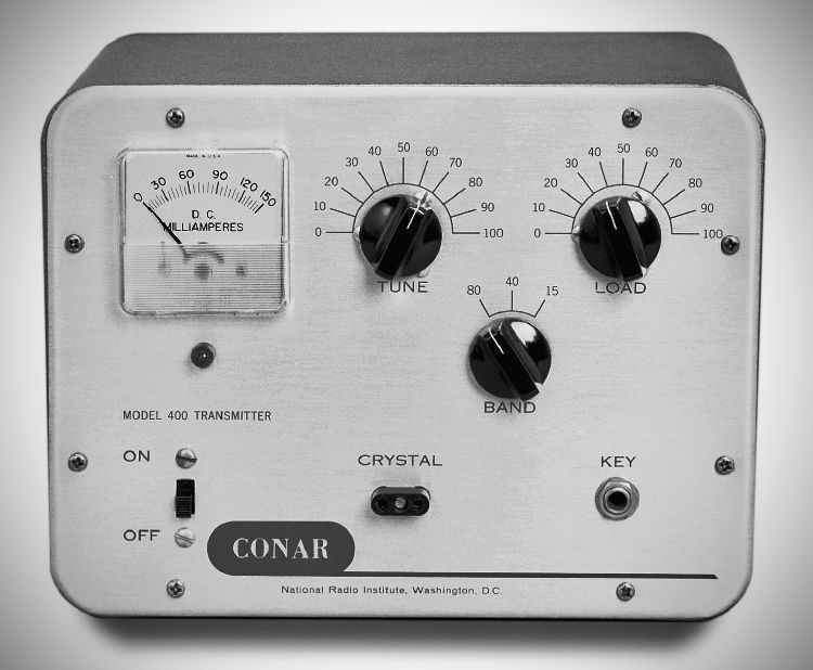 The Conar 400 transmitter and Conar 500 receiver were sold as kits by NRI, the National Radio Institute. The pair are affectionately known as the Conar Twins. The 400 is a classic novice transmitter.