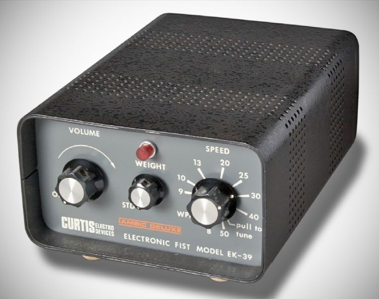 The Curtis EK-39 “Electronic Fist” iambic keyer had an internal AC supply and self-completing dots and dashes. A rear-panel switch selected either transistor- or reed-relay keying. An “M” version had a message memory in the form of a factory-programmed ROM IC.