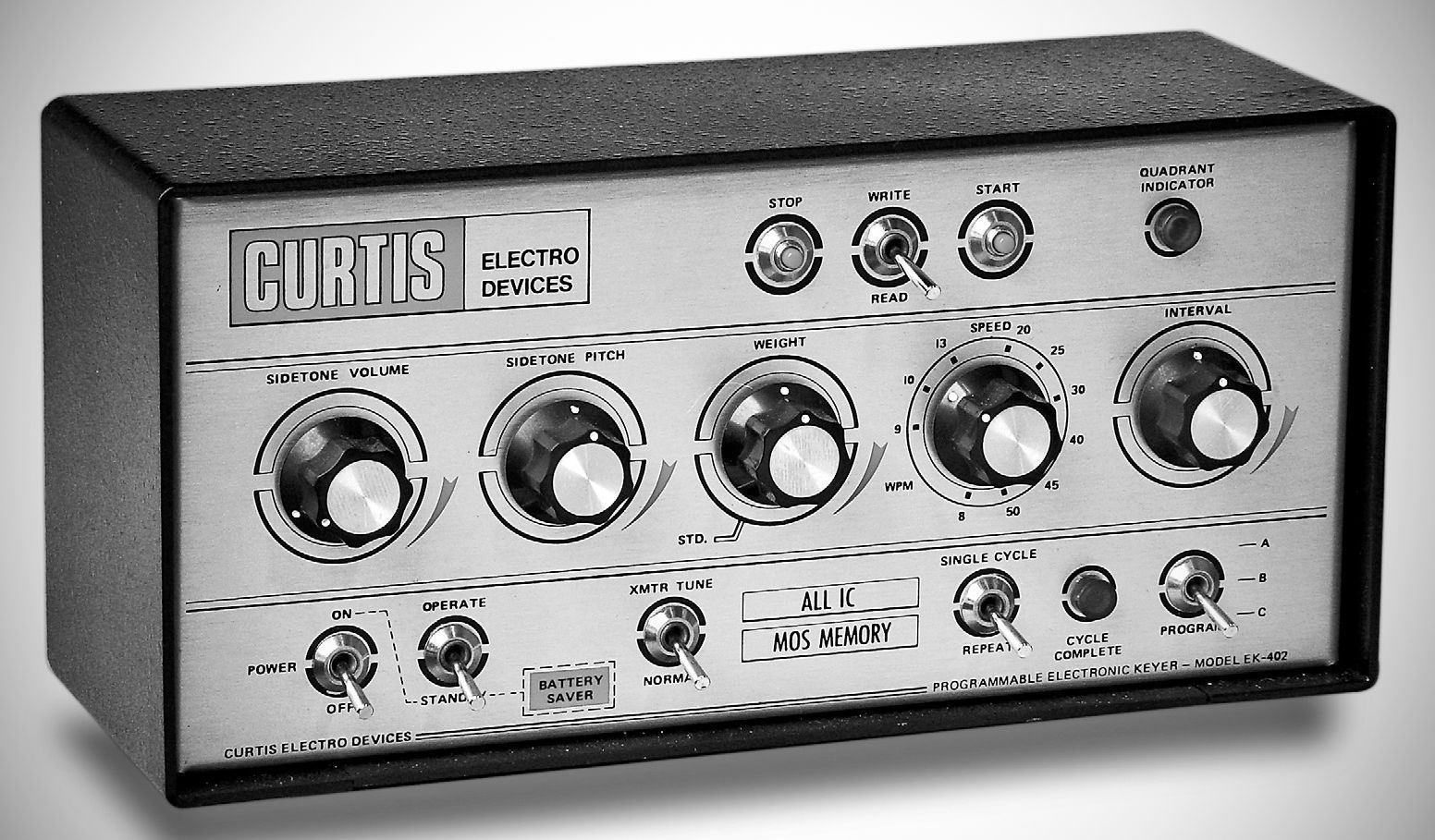 The Curtis EK-402 keyer had four quadrants of 64-bit programmable memory. They were selectable in three banks (quadrants three and four were linked together). The programmable messages had a delay and repeat function. The EK-402 had an internal AC supply. A 9 volt battery retained programmed messages when the key was disconnected from the AC line.