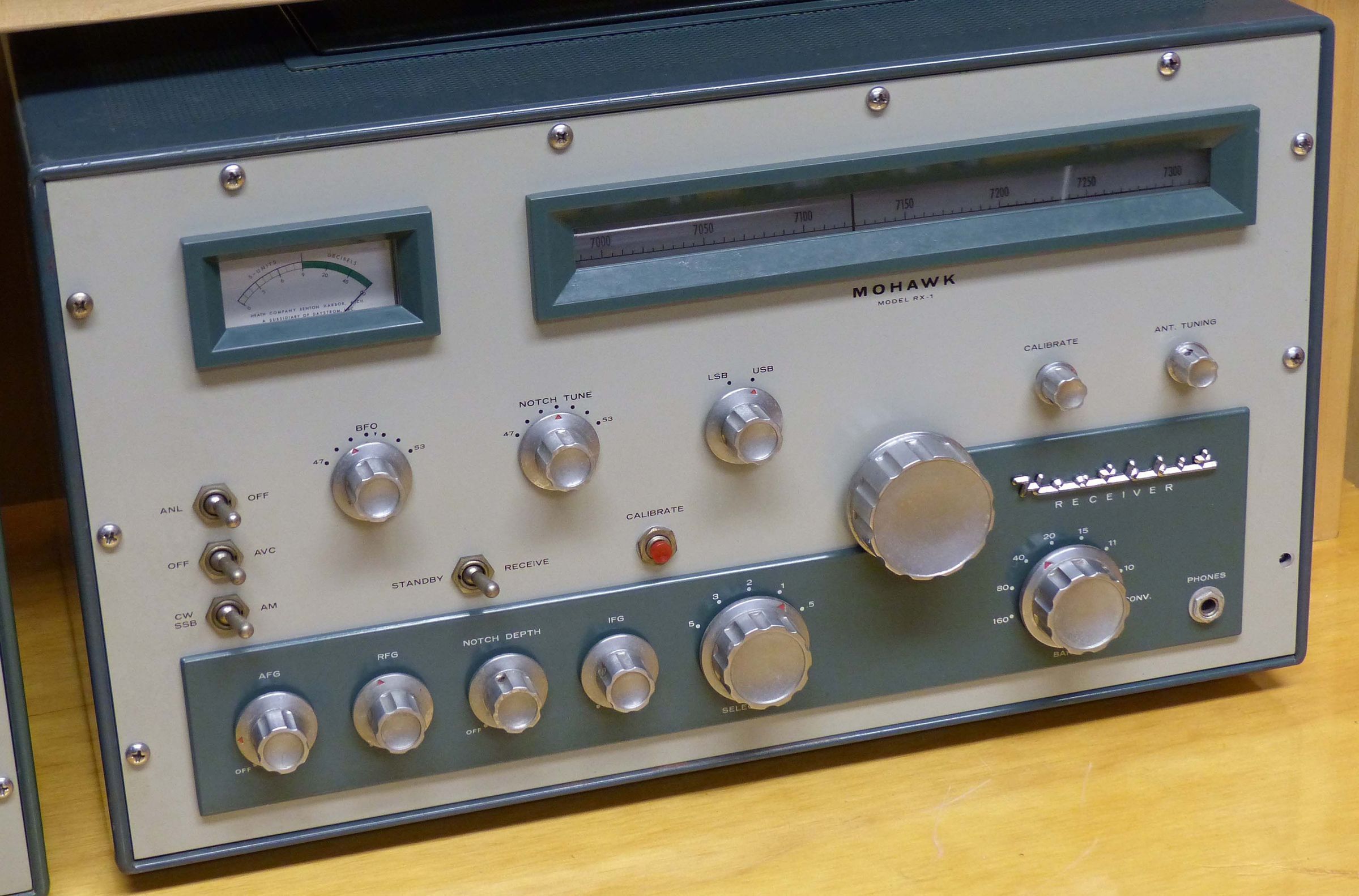 The unit has a two-tone green front panel with darker green copper clad cabinet. Early RX-1s were shipped with satin finish aluminum knobs, while later versions used polished knobs. In 1963 the RX-1 was replaced by the sleek SB-300—patterned after the Collins S line. Heath continued to sell the RX-1 until supplies ran out early in 1964.