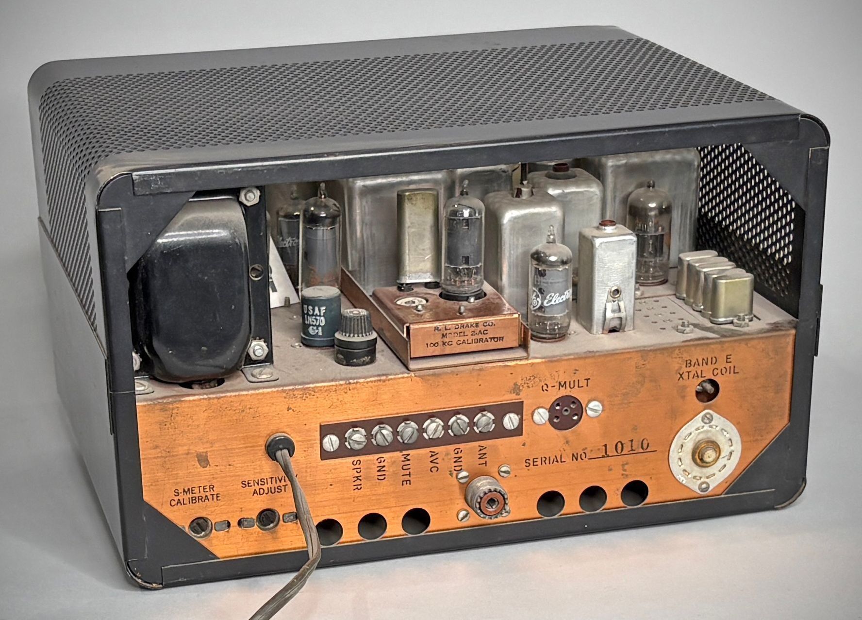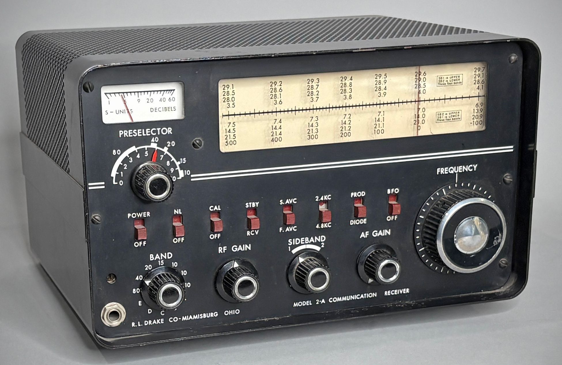 The 2-A was triple-conversion, used 10 tubes, and tuned 3.5-30 MHz in twelve 600 kHz segments. Seven of these were dedicated to the 80 through 10 meter ham bands. The remainder could be set for other 600 kHz ranges within the receiver's coverage limits by inserting appropriate crystals. The 2-A offered 2.4 and 4.8 kHz selectivity. It had a product detector and passband-tuning sideband selection.