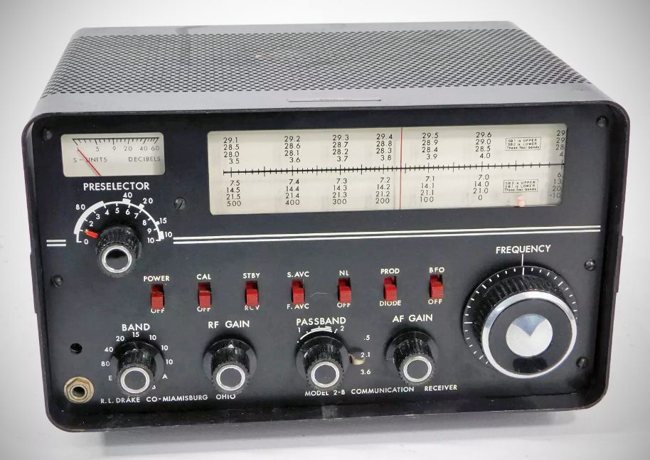 The 2-B built on the strengths of Drake's 2-A model. It offered selectivity in 0.5, 2.1, and 3.6 kHz steps and had an improved passband tuner. It covered 80-10 meters in seven 600kHz ranges. Five others could be used anywhere between 3.5 and 30 MHz with optional crystals.