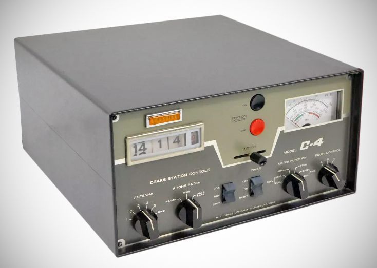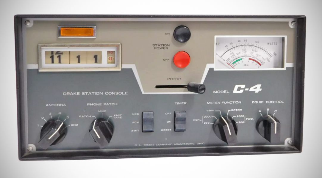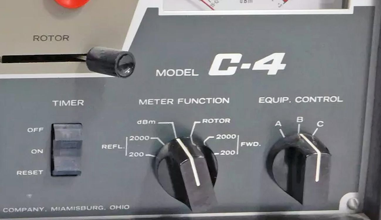 "Power Master" station power control – Large black and red push buttons on the front panel operate a contactor in a separate cabinet that can be located up to six feet away from the C-4. This cabinet has eight 120 VAC outlets for control of station accessories, and two 240 VAC outlets for control of amplifiers or other equipment. A hidden "safety switch" can be used to disable the Power Master when the station is left unattended.
