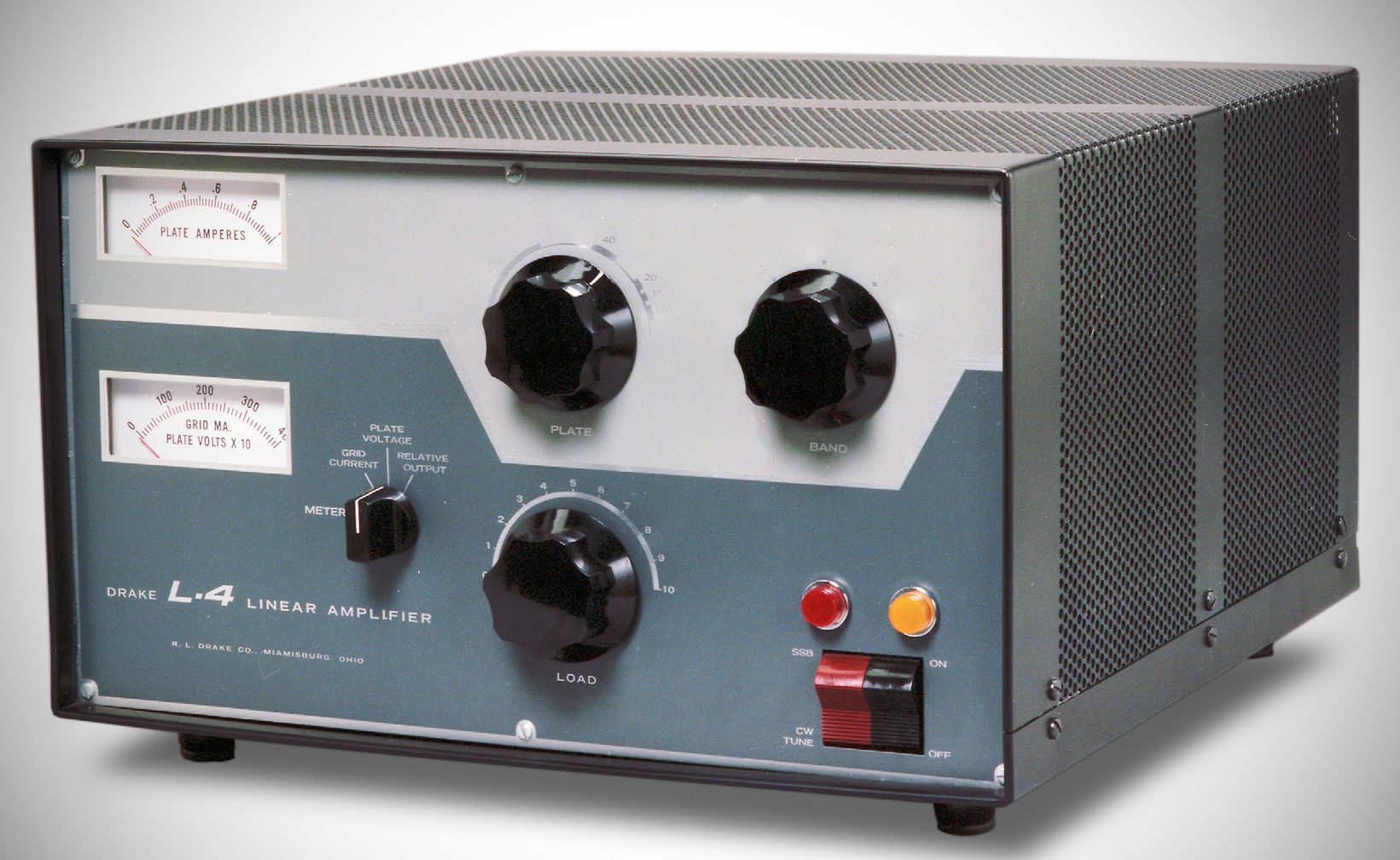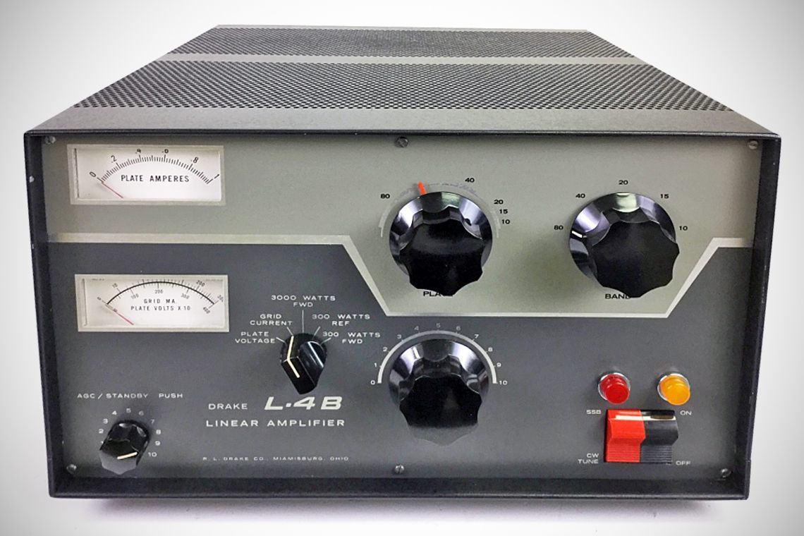 The Class B grounded-grid L-4 ran 2000 watts PEP SSB and1000 watts DC input on CW, AM, and RTTY. Drake’s amp used a pair of 3-400Z or 8163 tubes. Quick-heating filaments allowed the amplifier to remain off until needed. A warmup of only 3 seconds was required. The L-4 covered 80–10 meters. Its solid-state power supply was on a separate chassis.