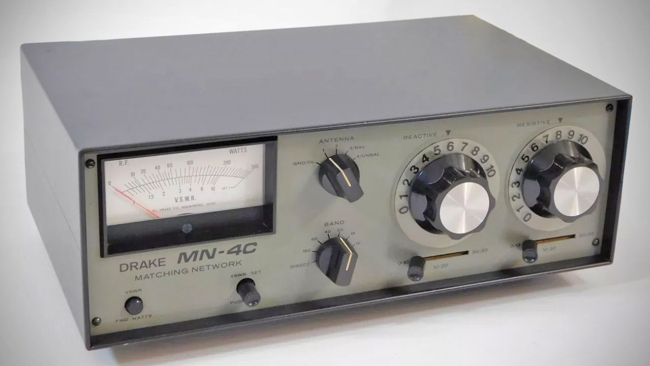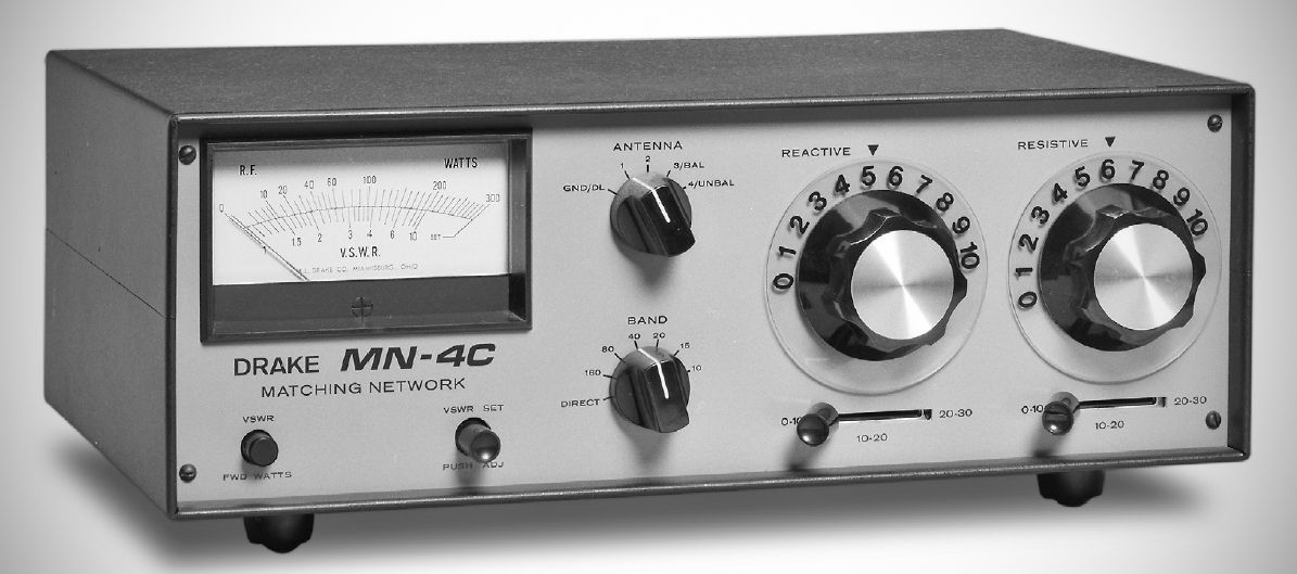 Ham Radio, Feb 1978, p. 46. The C-Line matching network extended coverage to 160 meters and matched balanced antennas when its optional balun was installed. The MN-4C handled 250 watts. Its meter read RF watts and VSWR.