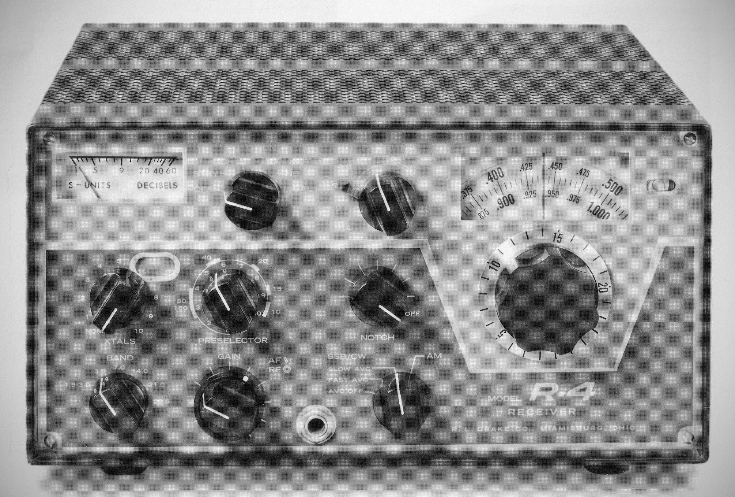 Drake's R-4 receiver tuned fifteen 500 kHz ranges between 1.5-30 MHz (with the exception of 5 to 6 MHz) and was supplied with crystals for 80, 40, 20, 15 meters, and 28.5-29 MHz on 10 meters. The crystal switch had 1 0 spare positions for optional crystals. Its linear PTO had 1 kHz dial divisions. The double-conversion receiver had a first IF at 5645 kHz with a crystal lattice filter and a 50 kHz 2nd IF with UC filtering. Its passband tuning offered bandwidths of 0.4, 1.2, 2.4, and 4.8 kHz. The R-4 used 13 tubes and 7 diodes. It had a noise blanker, notch filter, and crystal calibrator.