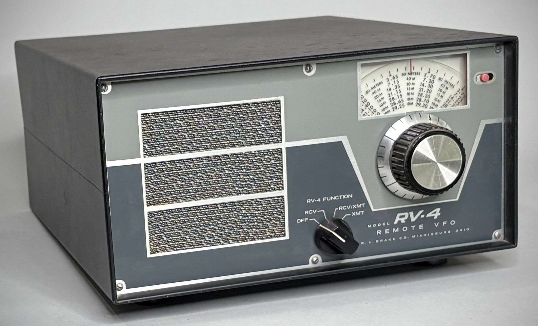The RV-4 remote VFO controlled the transmit, receive, or transceive frequency of the TR-4. It could also be switched offline, returning control to the TR-4’s PTO. The RV-4 was solid-state with the exception of a VR tube and cathode follower.