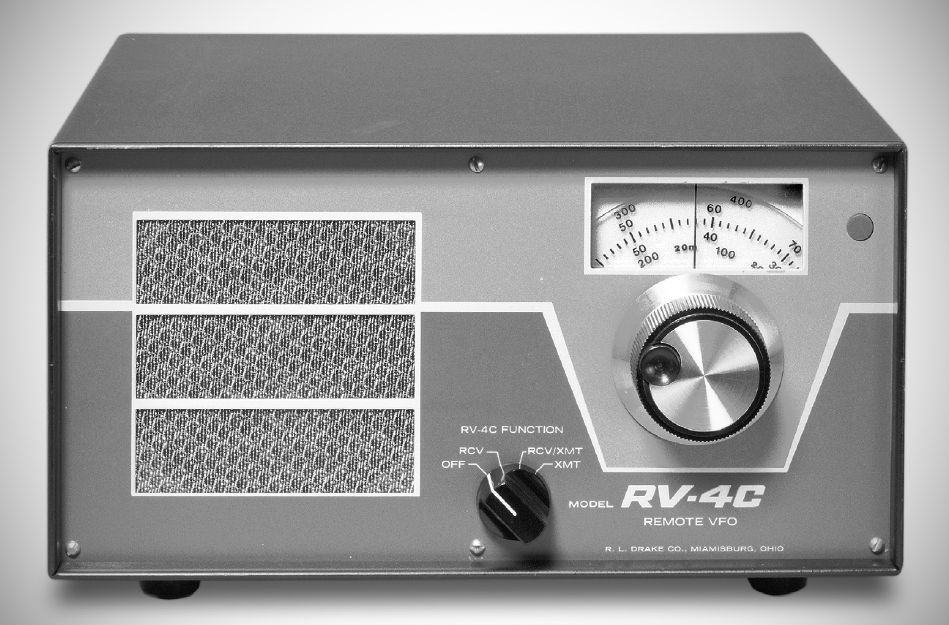 The RV-4C remote VFO for the TR-4C could be used with older TR-3 and TR-4 transceivers as well. It con-trolled the transmit frequency, the receive frequency, or both. The unit used a solid-state PTO and a 12AU7 cathode follower. The RV-4C had a built-in 5 inch speaker and had room for the transceiver’s AC-4 power supply; $110.00,.