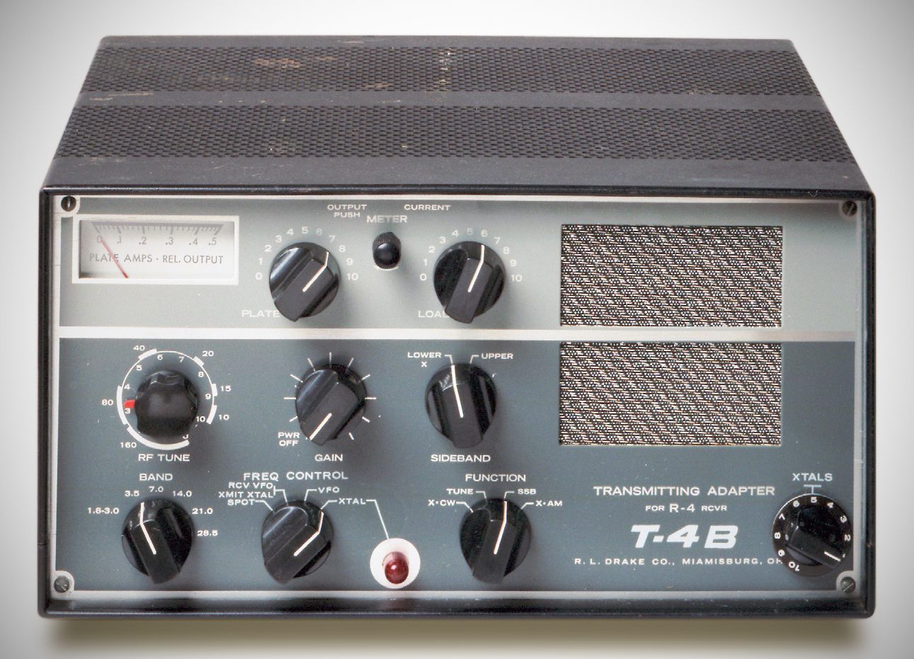 The T-4(B) Receiter was a receiver-controlled exciter. It was Drake's T-4X transmitter minus the PTO, designed to transceive with the R-4 receiver. It used a pair of 6JB6 tubes in the final and ran 200 watts PEP input on SSB. Input on CW was 180 watts, 50 watts on AM.